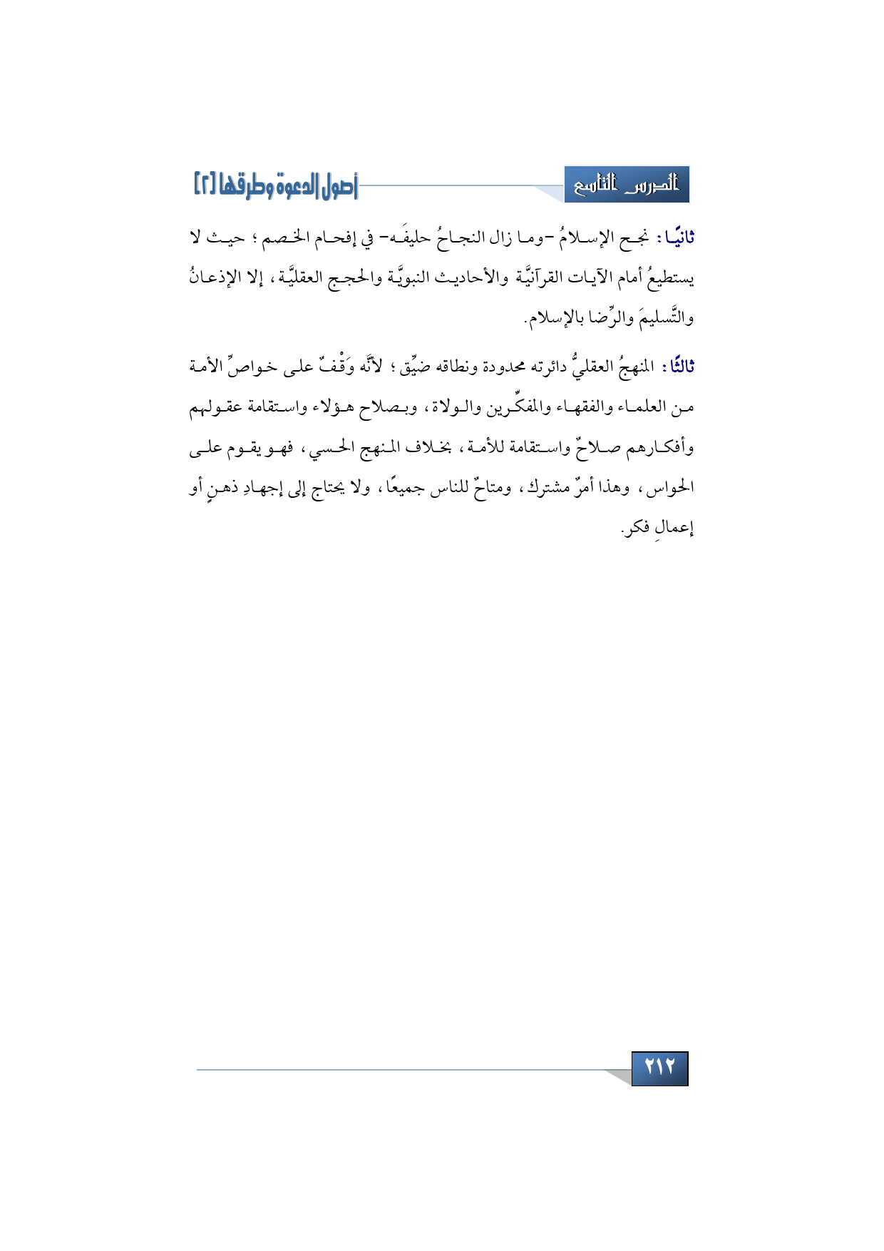 3 - المنهجُ العقليُّ، دائرته محدودة ونطاقه ضيِّق؛ لأنَّه وَقْفٌ على خواصِّ الأمة من العلماء والفقهاء والمفكِّرين والولاة، وبصلاح هؤلاء واستقامة عقولهم وأفكارهم صلاحٌ واستقامة للأمة، بخلاف المنهج الحسي، فهو يقوم على الحواس، وهذا أمرٌ مشترك، ومتاحٌ للناس جميعاً، ولا يحتاج إلى إجهادِ ذهنٍ أو إعمالِ فكر.