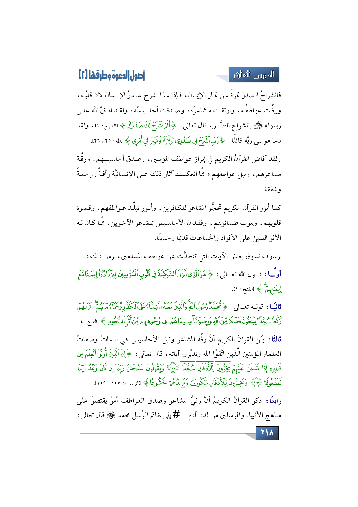 3 - بيَّن القرآنُ الكريم أنَّ رقَّة المشاعر ونبل الأحاسيس، هي سماتُ وصفاتُ العلماءِ المؤمنين، الَّذين اتَّقَوُا الله وتدبَّروا آياته، قال تعالى:
