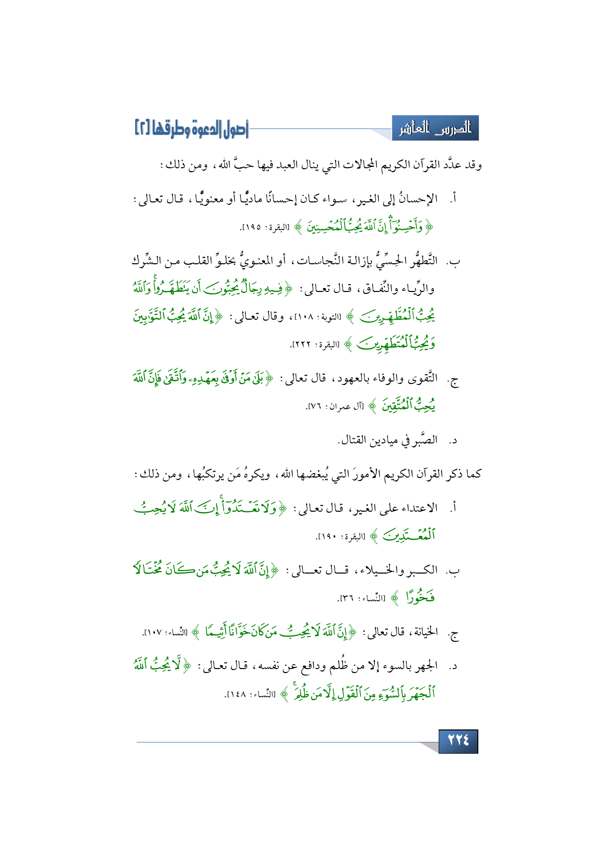 وقد عدَّد القرآن الكريم المجالات التي ينال العبد فيها حبَّ الله، ومن ذلك: