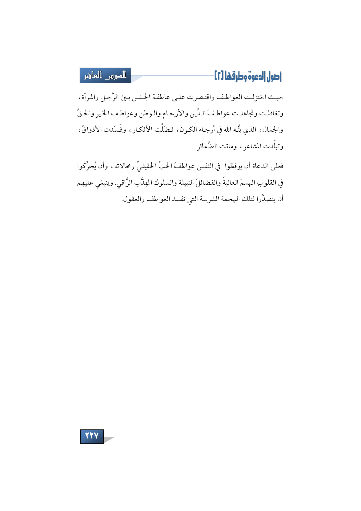 فعلى الدعاة: أن يوقظوا في النفس عواطفَ الحبِّ الحقيقيِّ ومجالاته، وأن يُحرِّكوا في القلوبِ الهممَ العاليةَ والفضائلَ النبيلة والسلوك المهذَّب الرَّاقي. وينبغي عليهم أن يتصدَّوا لتلك الهجمة الشرسة التي تفسد العواطف والعقول.