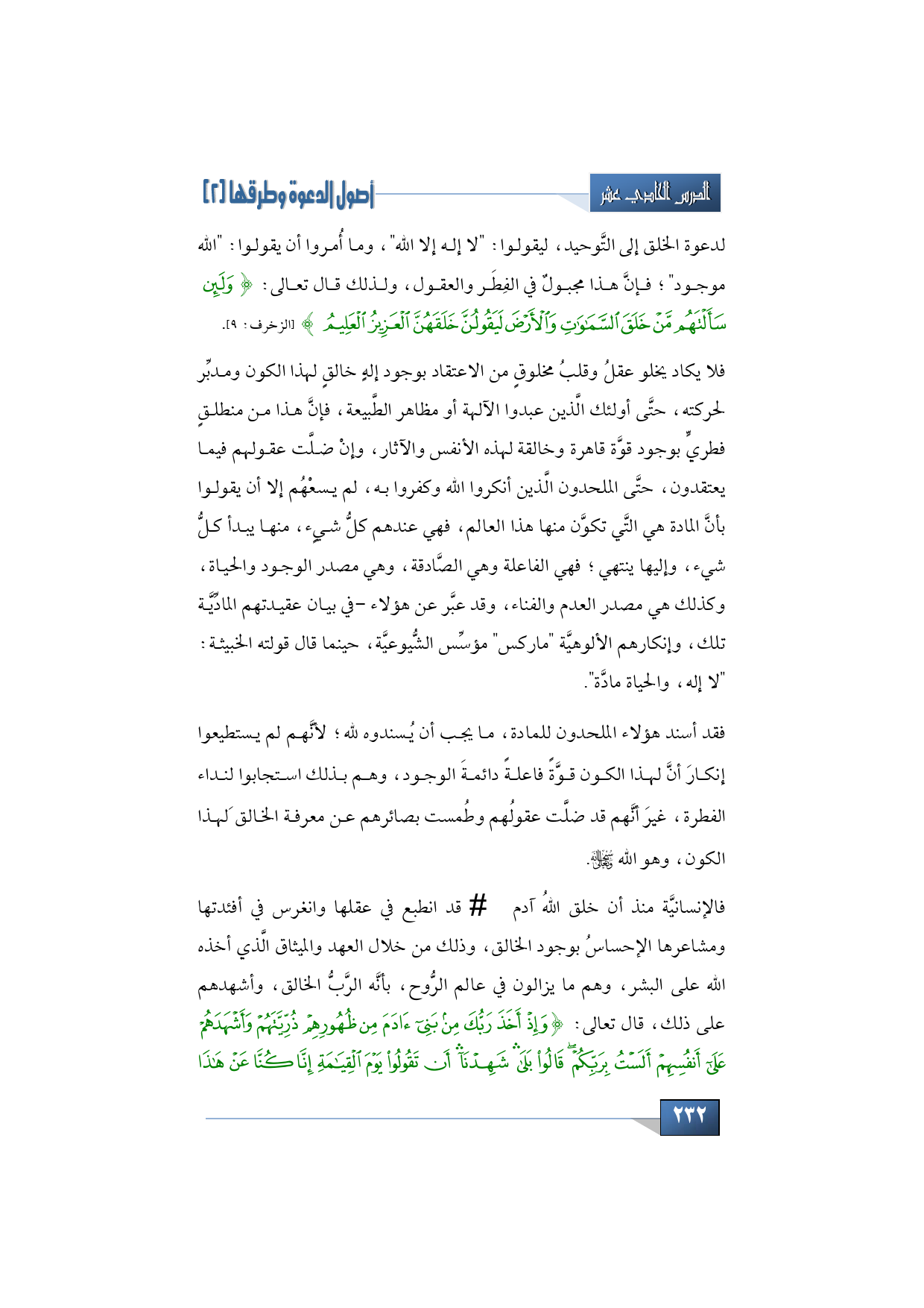 فلا يكاد يخلو عقلُ وقلبُ مخلوقٍ من الاعتقاد بوجود إلهٍ خالقٍ لهذا الكون ومدبِّر لحركته، حتَّى أولئك الَّذين عبدوا الآلهة أو مظاهر الطَّبيعة، فإنَّ هذا من منطلقٍ فطريٍّ بوجود قوَّة قاهرة وخالقة لهذه الأنفس والآثار، وإنْ ضلَّت عقولهم فيما يعتقدون، حتَّى الملحدون الَّذين أنكروا الله وكفروا به، لم يسعْهُم إلا أن يقولوا بأنَّ المادة هي التَّي تكوَّن منها هذا العالم، فهي عندهم كلُّ شيٍء، منها يبدأ كلُّ شيء، وإليها ينتهي؛ فهي الفاعلة وهي الصَّادقة، وهي مصدر الوجود والحياة، وكذلك هي مصدر العدم والفناء، وقد عبَّر عن هؤلاء -في بيان عقيدتهم المادِّيَّة تلك، وإنكارهم الألوهيَّة "ماركس" مؤسِّس الشُّيوعيَّة، حينما قال قولته الخبيثة: "لا إله، والحياة مادَّة".