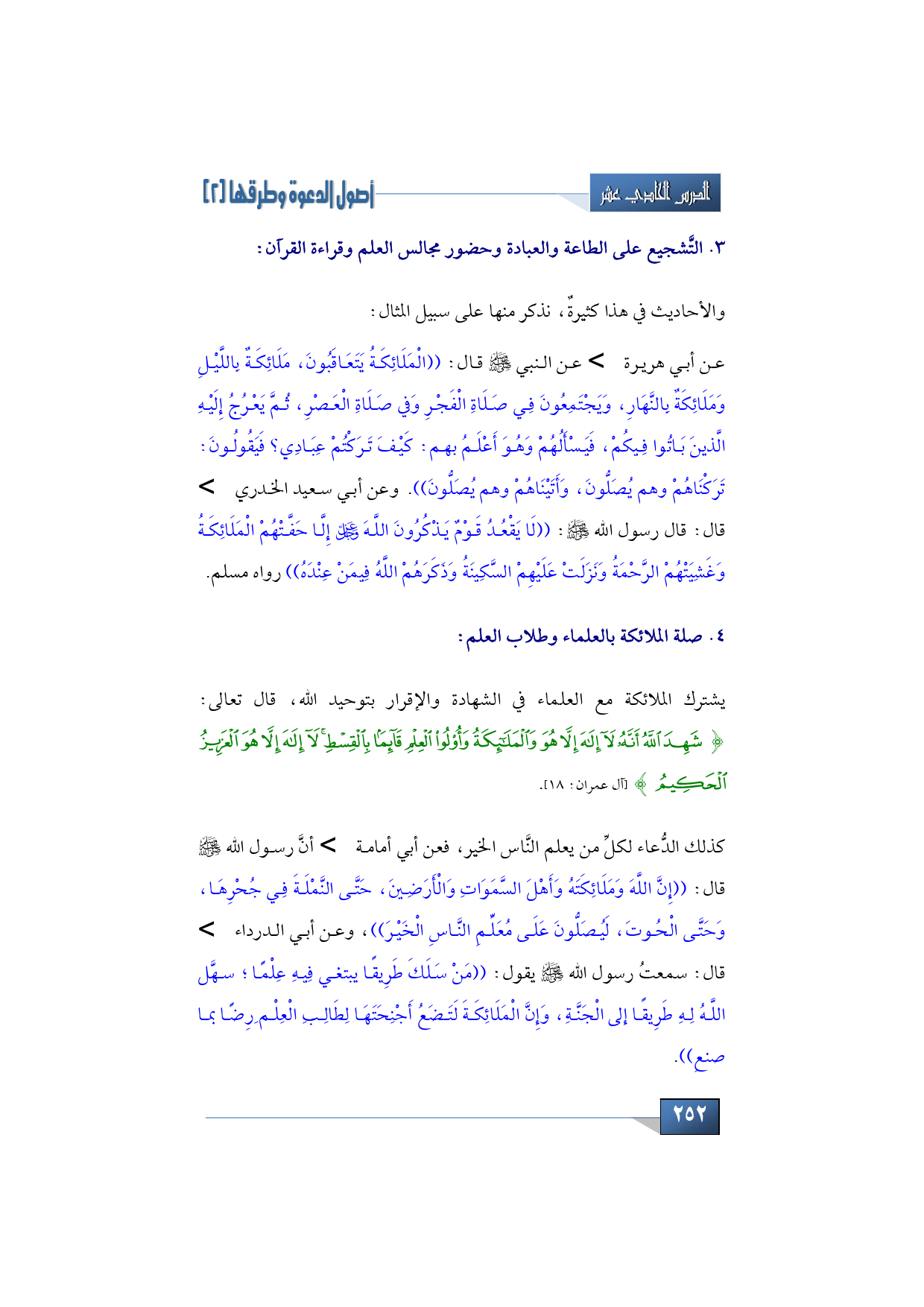 الثَّالث: التَّشجيع على الطاعة والعبادة وحضور مجالس العلم وقراءة القرآن: