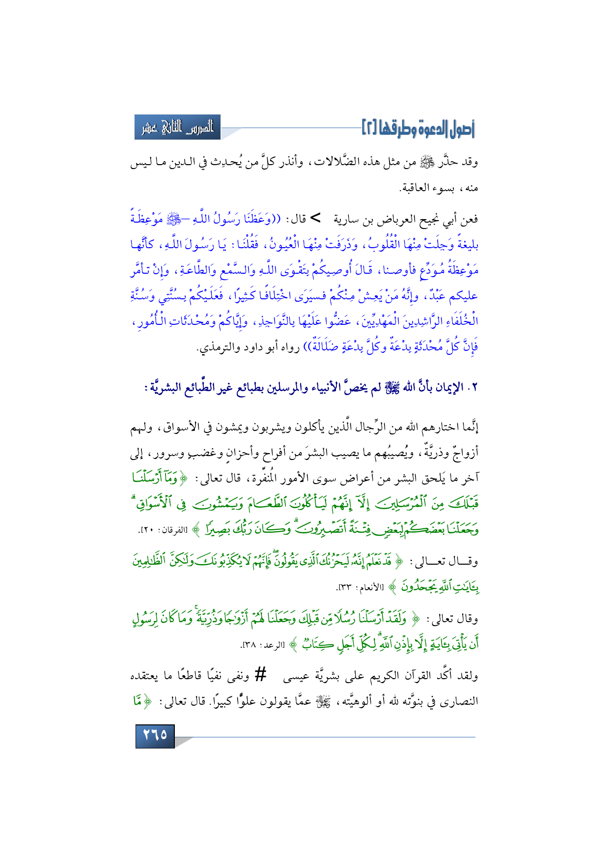 فعن أبي نجيح العرباض بن سارية -رضي الله عنه- قال: ((وَعَظَنَا رَسُولُ اللَّهِ -صَلَّى اللَّهُ عَلَيْهِ وَسَلَّمَ- مَوْعِظَةً بليغةً، وَجِلَتْ مِنْهَا الْقُلُوبُ، وَذَرَفَتْ مِنْهَا الْعُيُونُ، فَقُلْنَا: يَا رَسُولَ اللَّهِ، كأنَّها مَوْعِظَةُ مُوَدِّعٍ فأوصنا، قَالَ أُوصِيكُمْ بِتَقْوَى اللَّهِ وَالسَّمْعِ وَالطَّاعَةِ، وَإِنْ تأمَّر عليكم عَبْدٌ، وإِنَّهُ مَنْ يَعِشْ مِنْكُمْ فسيَرَى اخْتِلَافًا كَثِيرًا، فَعَلَيْكُمْ بِسُنَّتِي وَسُنَّةِ الْخُلَفَاءِ الرَّاشِدِينَ الْمَهْدِيِّينَ، عَضُّوا عَلَيْهَا بِالنَّوَاجِذِ، وَإِيَّاكُمْ وَمُحْدَثَاتِ الْأُمُورِ، فَإِنَّ كُلَّ مُحْدَثَةٍ بِدْعَةٌ وكُلَّ بِدْعَةٍ ضَلَالَةٌ)) رواه أبو داود والترمذي.