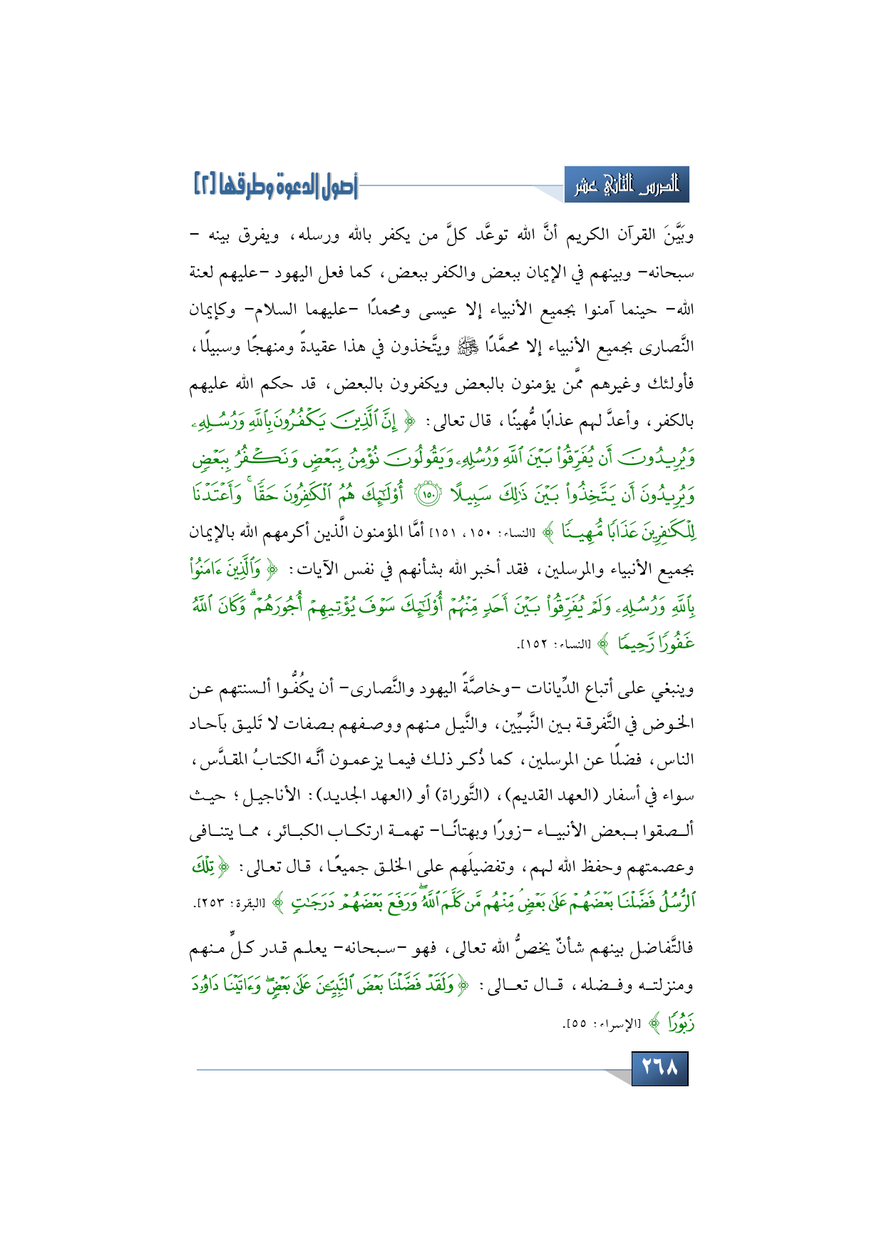 وبَيَّنَ القرآن الكريم أنَّ الله توعَّد كلَّ من يكفر بالله ورسله، ويفرق بينه -سبحانه- وبينهم في الإيمان ببعض والكفر ببعض، كما فعل اليهود -عليهم لعنة الله- حينما آمنوا بجميع الأنبياء إلا عيسى ومحمداً -عليهما السلام- وكإيمان النَّصارى بجميع الأنبياء إلا محمَّداً -صلَّى الله عليه وسلَّم- ويتَّخذون في هذا عقيدةً ومنهجاً وسبيلاً، فأولئك وغيرهم ممَّن يؤمنون بالبعض ويكفرون بالبعض، قد حكم الله عليهم بالكفر، وأعدَّ لهم عذاباً مُّهيناً. قال تعالى: