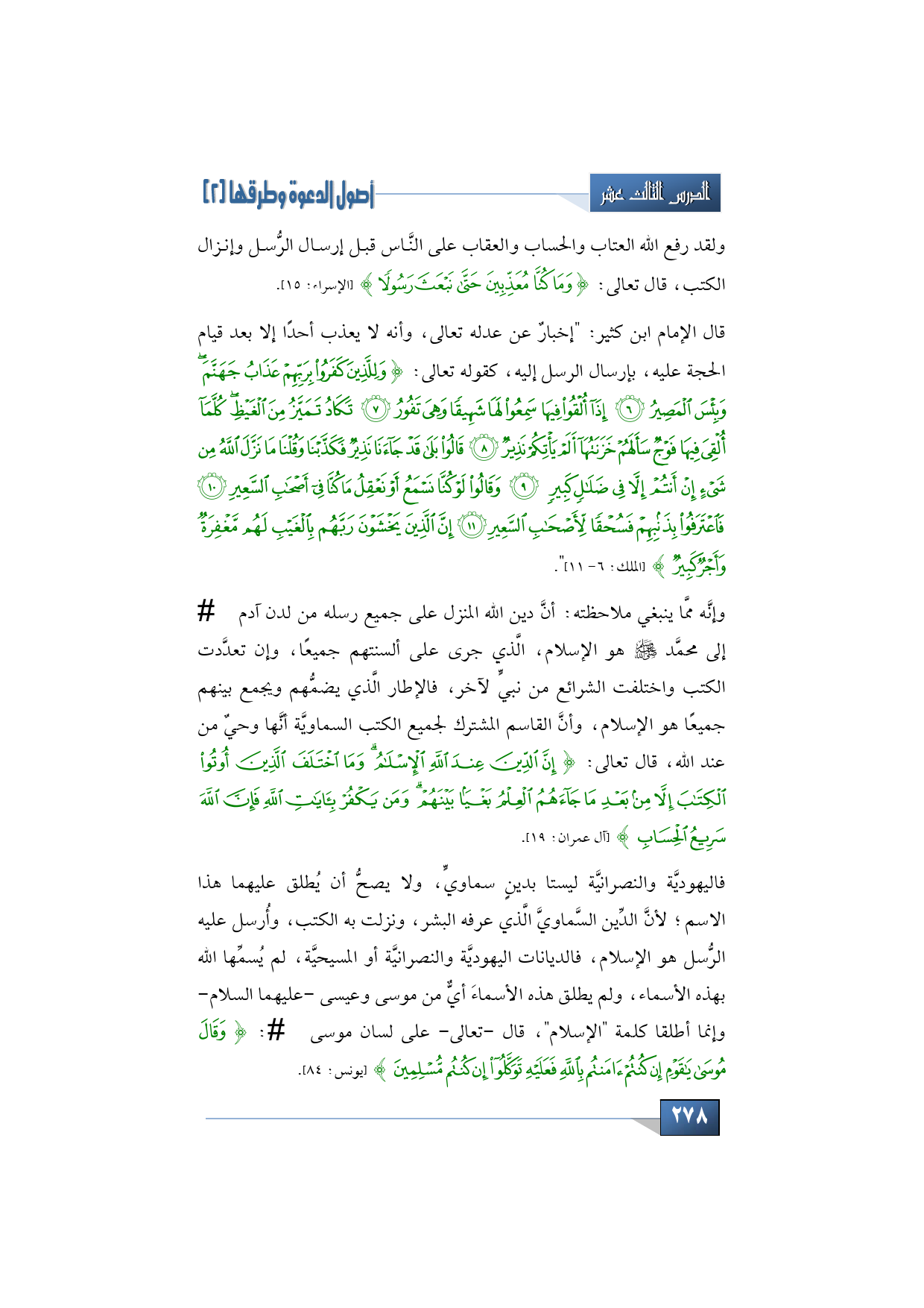 وإنَّه ممَّا ينبغي ملاحظته: أنَّ دين الله المنزل على جميع رسله، من لدن آدم -عليه السلام- إلى محمَّد -صلَّى الله عليه وسلَّم- هو الإسلام، الَّذي جرى على ألسنتهم جميعاً، وإن تعدَّدت الكتب واختلفت الشرائع من نبيٍّ لآخر، فالإطار الَّذي يضمُّهم ويجمع بينهم جميعاً، هو الإسلام وأنَّ القاسم المشترك لجميع الكتب السماويَّة، أنَّها وحيٌ من عند الله، قال تعالى: