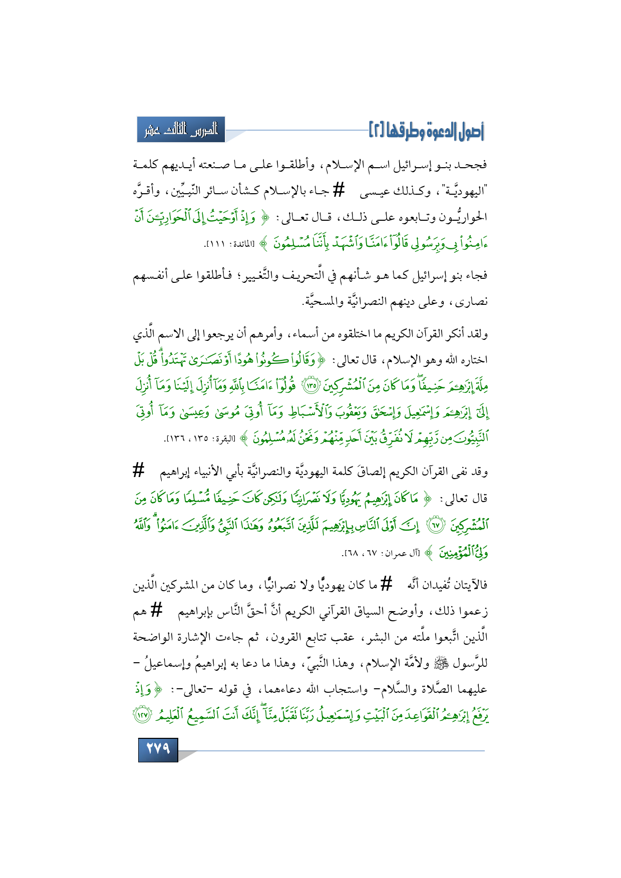 {وَقَالُوا كُونُوا هُوداً أَوْ نَصَارَى تَهْتَدُوا قُلْ بَلْ مِلَّةَ إِبْرَاهِيمَ حَنِيفاً وَمَا كَانَ مِنَ الْمُشْرِكِينَ * قُولُوا آمَنَّا بِاللَّهِ وَمَا أُنْزِلَ إِلَيْنَا وَمَا أُنْزِلَ إِلَى إِبْرَاهِيمَ وَإِسْمَاعِيلَ وَإِسْحَاقَ وَيَعْقُوبَ وَالْأَسْبَاطِ وَمَا أُوتِيَ مُوسَى وَعِيسَى وَمَا أُوتِيَ النَّبِيُّونَ مِنْ رَبِّهِمْ لا نُفَرِّقُ بَيْنَ أَحَدٍ مِنْهُمْ وَنَحْنُ لَهُ مُسْلِمُونَ} [البقرة:125 - 126].