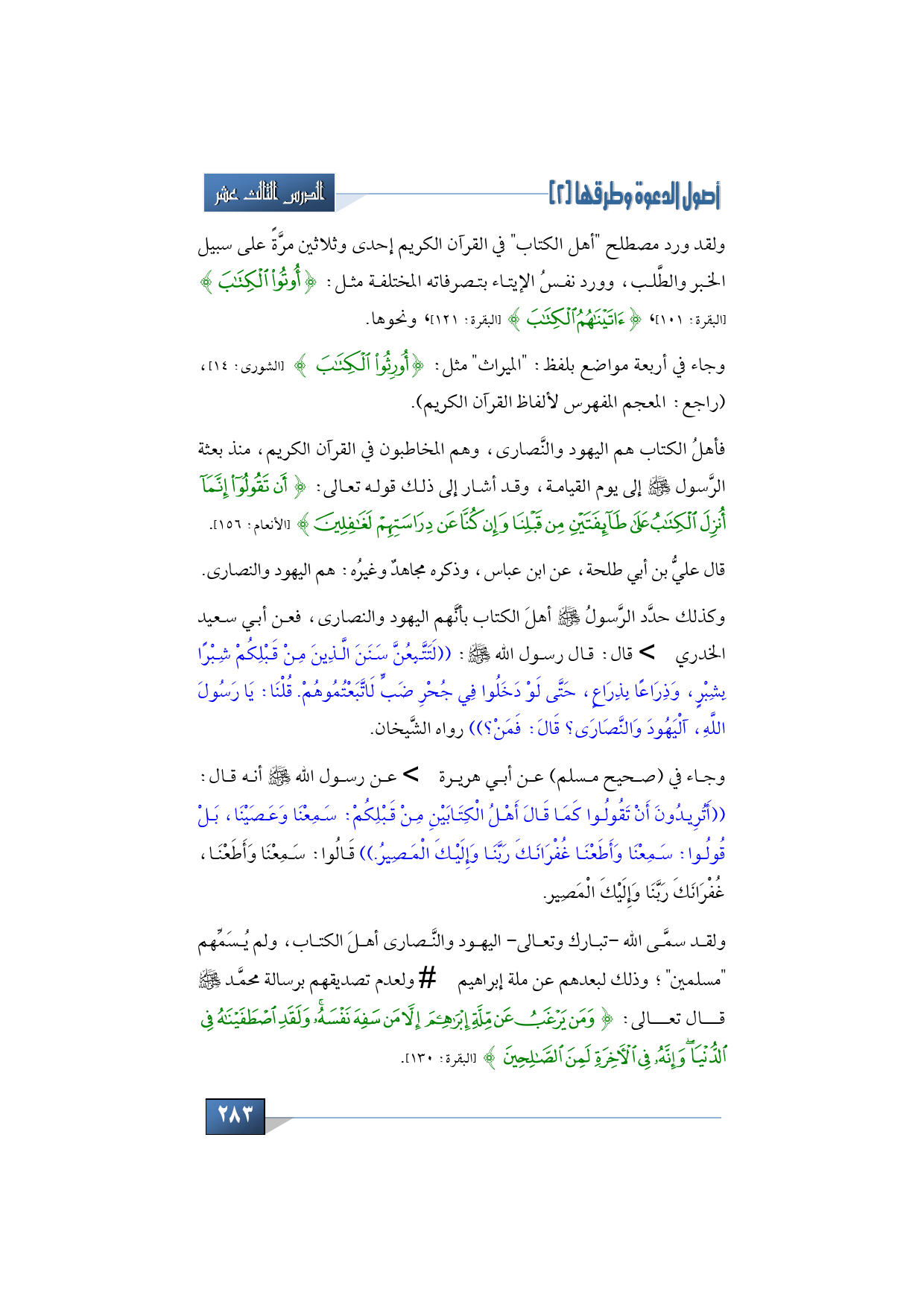 وكذلك حدَّد الرَّسولُ -صلَّى الله عليه وسلَّم- أهلَ الكتاب بأنَّهم اليهود والنصارى، فعن أبي سعيد الخدري -رضي الله تعالى عنه- قال: قال رسول الله -صلَّى الله عليه وسلَّم-: ((لَتَتَّبِعُنَّ سَنَنَ الَّذِينَ مِنْ قَبْلِكُمْ شِبْرًا بِشِبْرٍ، وَذِرَاعًا بِذِرَاعٍ، حَتَّى لَوْ دَخَلُوا فِي جُحْرِ ضَبٍّ لَاتَّبَعْتُمُوهُمْ.)) قُلْنَا: يَا رَسُولَ اللَّهِ، آلْيَهُودَ وَالنَّصَارَى؟ قَالَ: ((فَمَنْ؟)) رواه الشَّيخان.