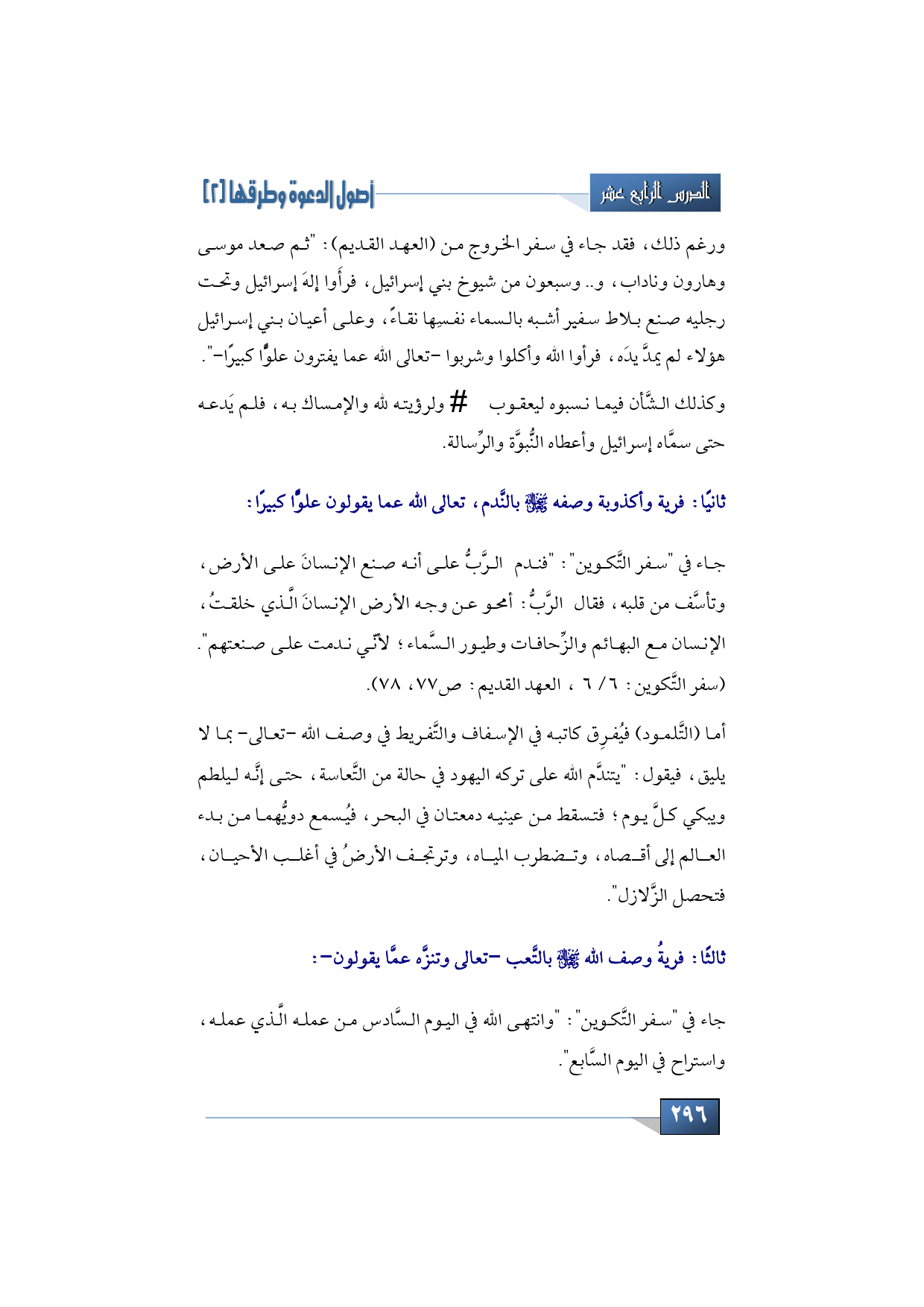 ورغم ذلك، فقد جاء في سفر الخروج، من "العهد القديم": "ثم صعد موسى وهارون وناداب، و .. وسبعون من شيوخ بني إسرائيل، فرأَوا إلهَ إسرائيل، وتحت رجليه صنع بلاط سفير أشبه بالسماء نفسِها نقاءً، وعلى أعيان بني إسرائيل هؤلاء، لم يمدَّ يدَه، فرأوا الله وأكلوا وشربوا -تعالى الله عما يفترون علوَّاً كبيراً-". وكذلك الشَّأن فيما نسبوه ليعقوب -عليه السلام-، ولرؤيته لله والإمساك به، فلم يَدعه حتى سمَّاه إسرائيل وأعطاه النُّبوَّة والرِّسالة.