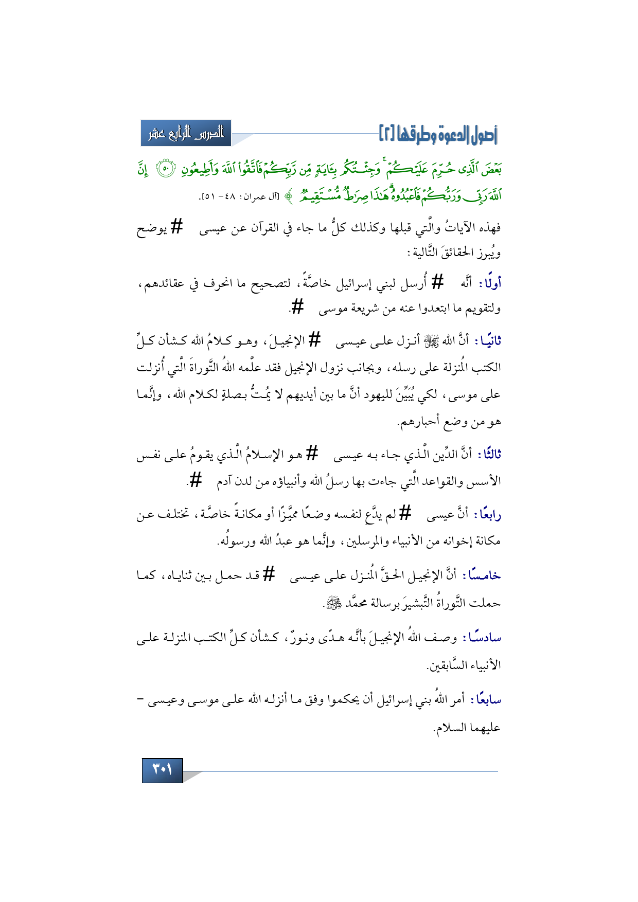 3 - أنَّ الدِّين الَّذي جاء به عيسى -عليه السَّلام- هو الإسلامُ الَّذي يقومُ على نفس الأسس والقواعد الَّتي جاءت بها رسلُ الله وأنبياؤه من لدن آدم -عليه السَّلام-.