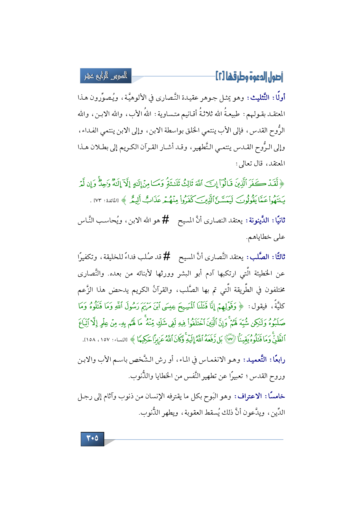 أولاً: التَّثليث: وهو يمثل جوهر عقيدة النَّصارى في الألوهيَّة، ويُصوِّرون هذا المعتقد بقولهم: طبيعةُ الله ثلاثةُ أقانيم متساوية: اللهُ الأب، والله الابن، والله الرُّوح القدس، فإلى الأب ينتمي الخلق بواسطة الابن، وإلى الابن ينتمي الفداء، وإلى الرُّوح القدس ينتمي التَّطهير، وقد أشار القرآن الكريم إلى بطلان هذا المعتقد، قال تعالى: