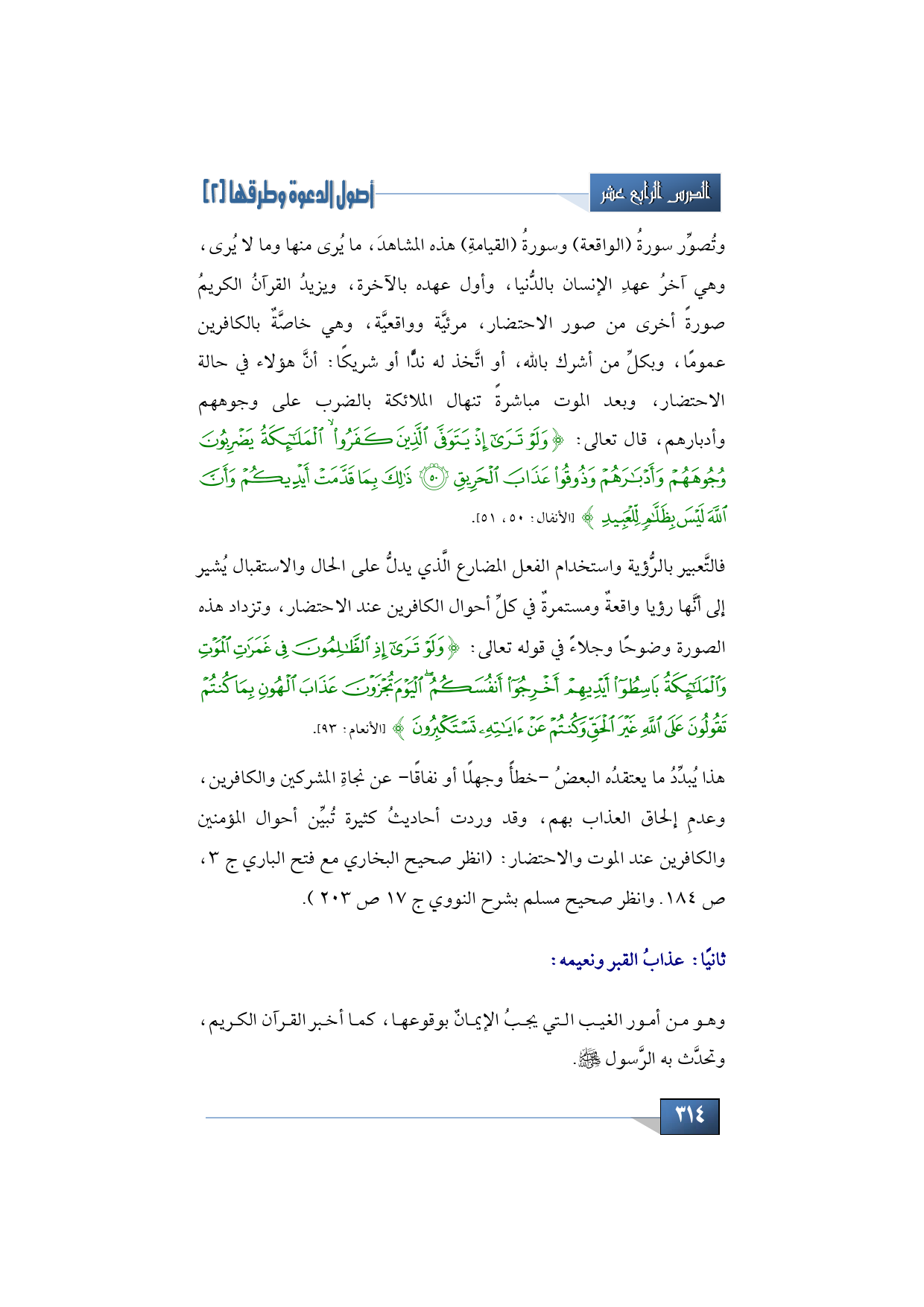 هذا يُبدِّدُ ما يعتقدُه البعضُ، خطأً وجهلاً أو نفاقاً، عن نجاةِ المشركين والكافرين، وعدمِ إلحاق العذاب بهم، وقد وردت أحاديثُ كثيرة، تُبيِّن أحوال المؤمنين والكافرين، عند الموت والاحتضار: (انظر صحيح البخاري، مع فتح الباري ج 3، ص 184. وانظر صحيح مسلم بشرح النووي ج 17 ص 203).