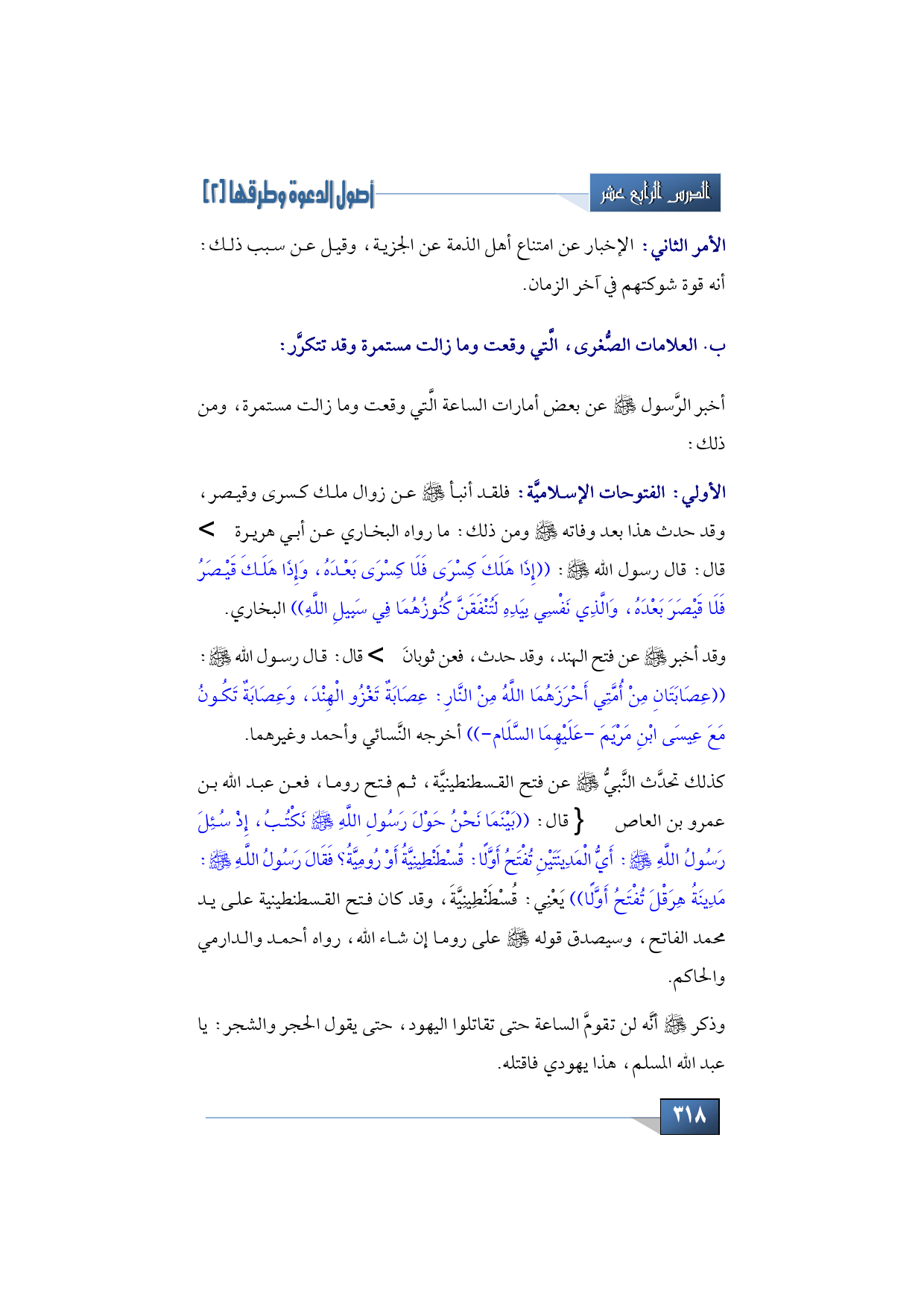 كذلك تحدَّث النَّبيُّ -صلَّى الله عليه وسلَّم- عن فتح القسطنطينيَّة، ثم فتح روما، فعن عبد الله بن عمرو بن العاص -رضي الله عنهما- قال: بَيْنَمَا نَحْنُ حَوْلَ رَسُولِ اللَّهِ -صَلَّى اللَّهُ عَلَيْهِ وَسَلَّمَ- نَكْتُبُ، إِذْ سُئِلَ رَسُولُ اللَّهِ -صَلَّى اللَّهُ عَلَيْهِ وَسَلَّمَ-: أَيُّ الْمَدِينَتَيْنِ تُفْتَحُ أَوَّلًا: قُسْطَنْطِينِيَّةُ أَوْ رُومِيَّةُ؟ فَقَالَ رَسُولُ اللَّهِ -صَلَّى اللَّهُ عَلَيْهِ وَسَلَّمَ-: ((مَدِينَةُ هِرَقْلَ تُفْتَحُ أَوَّلًا)) يَعْنِي قُسْطَنْطِينِيَّةَ وقد كان فتح القسطنطينية على يد محمد الفاتح، وسيصدق قوله -صلَّى الله عليه وسلَّم- على روما إن شاء الله، رواه أحمد والدارمي والحاكم.