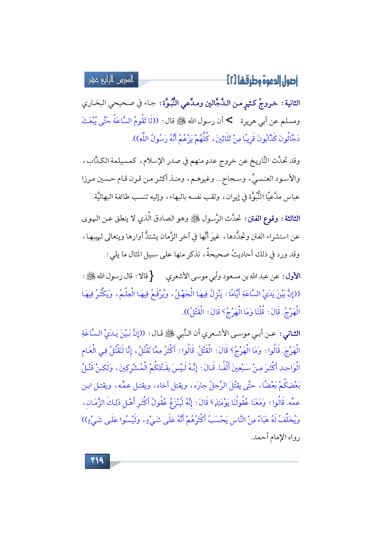 2 - خروجُ كثيرٍ من الدَّجَّالين ومدََّعي النُّبُوَّة: جاء في "صحيحي البخاري ومسلم" عن أبي هريرة -رضي الله تعالى عنه- أن رسول الله -صلَّى الله عليه وسلَّم- قال: ((لَا تَقُومُ السَّاعَةُ، حَتَّى يُبْعَثَ دَجَّالُونَ كَذَّابُونَ، قَرِيبًا مِنْ ثَلَاثِينَ، كُلُّهُمْ يَزْعُمُ أَنَّهُ رَسُولُ اللَّهِ)).