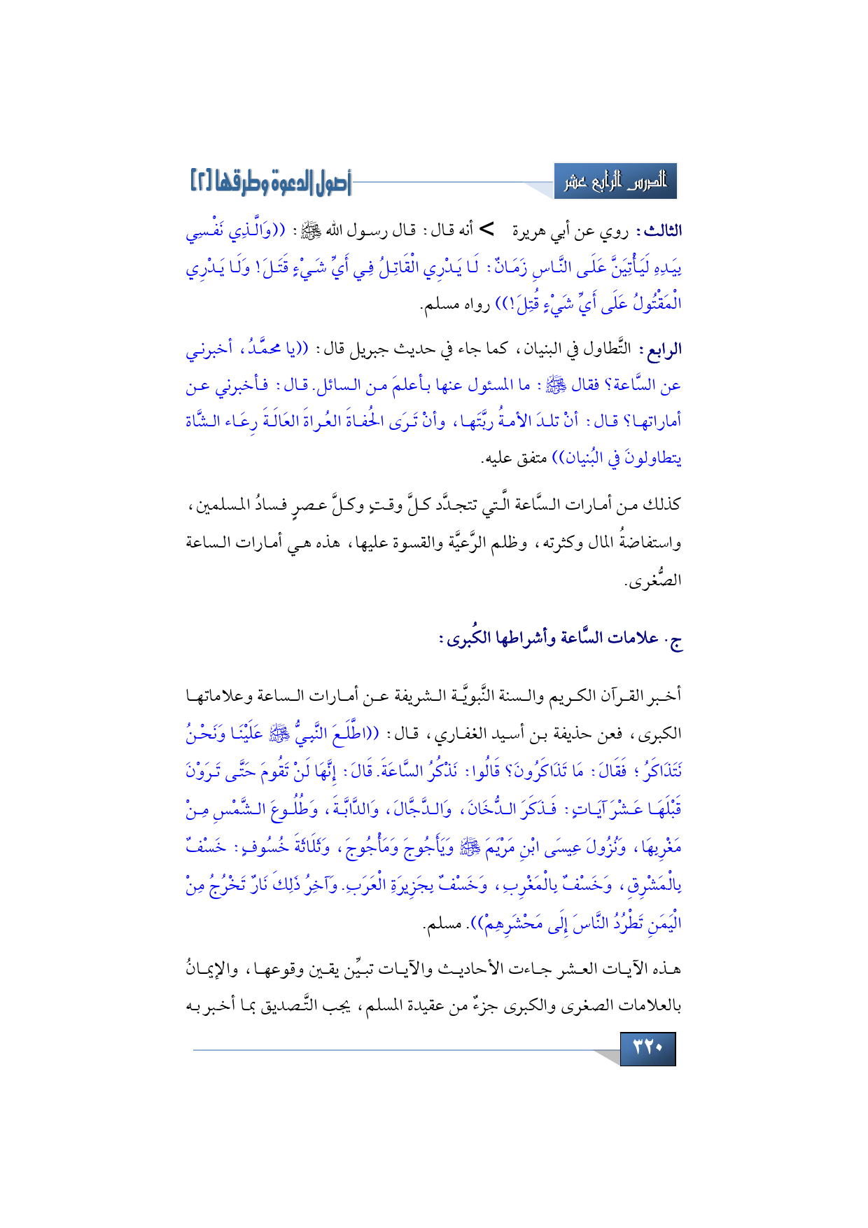 أخبر القرآن الكريم والسنة النَّبويَّة الشريفة، عن أمارات الساعة وعلاماتها الكبرى، فعن حذيفة بن أسيد الغفاري، قال: اطَّلَعَ النَّبِيُّ -صَلَّى اللَّهُ عَلَيْهِ وَسَلَّمَ- عَلَيْنَا، وَنَحْنُ نَتَذَاكَرُ، فَقَالَ: ((مَا تَذَاكَرُونَ؟)) قَالُوا: نَذْكُرُ السَّاعَةَ. قَالَ: ((إِنَّهَا لَنْ تَقُومَ حَتَّى تَرَوْنَ قَبْلَهَا عَشْرَ آيَاتٍ: فَذَكَرَ الدُّخَانَ، وَالدَّجَّالَ، وَالدَّابَّةَ، وَطُلُوعَ الشَّمْسِ مِنْ مَغْرِبِهَا، وَنُزُولَ عِيسَى ابْنِ مَرْيَمَ -صَلَّى اللَّهُ عَلَيْهِ وَسَلَّمَ- وَيَأَجُوجَ وَمَأْجُوجَ، وَثَلَاثَةَ خُسُوفٍ: خَسْفٌ بِالْمَشْرِقِ، وَخَسْفٌ بِالْمَغْرِبِ، وَخَسْفٌ بِجَزِيرَةِ الْعَرَبِ. وَآخِرُ ذَلِكَ نَارٌ تَخْرُجُ مِنْ الْيَمَنِ، تَطْرُدُ النَّاسَ إِلَى مَحْشَرِهِمْ)). مسلم.