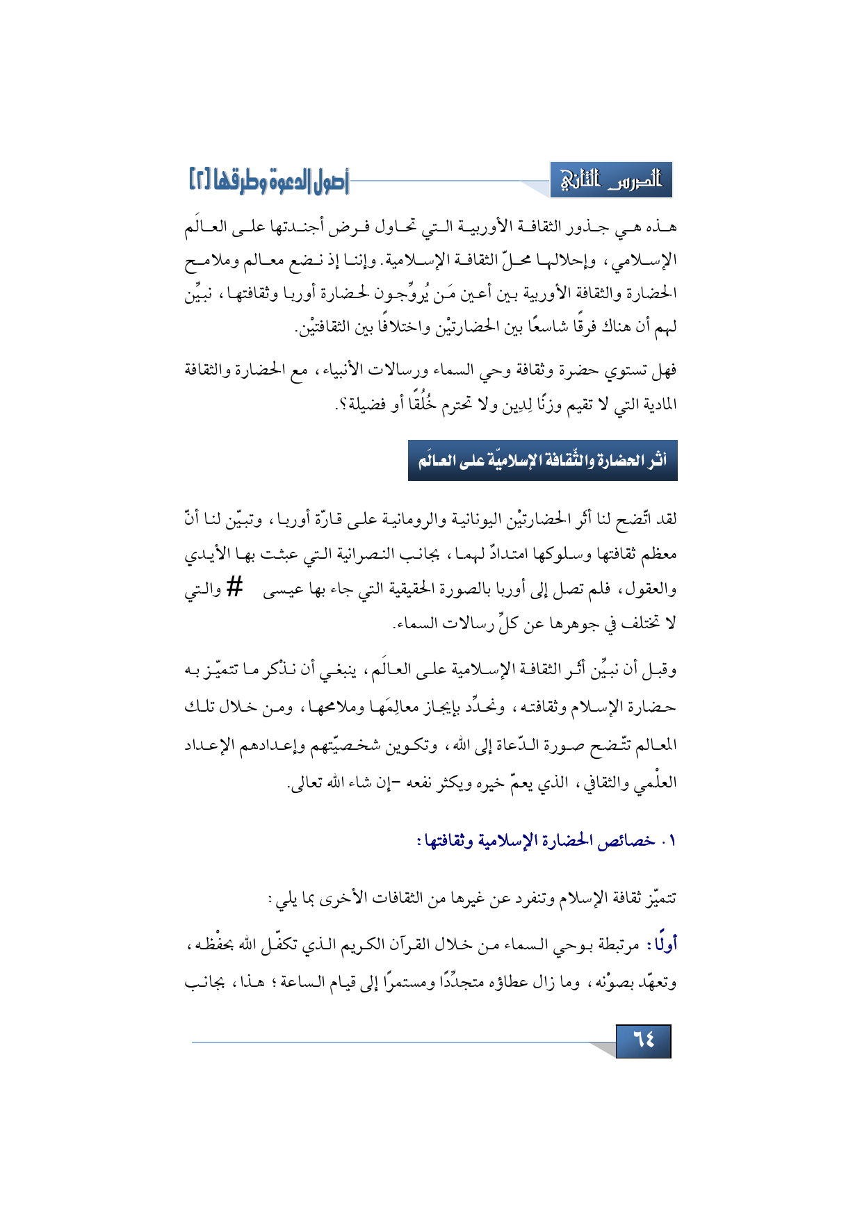 وقبل أن نبيِّن أثَر الثقافة الإسلامية على العالَم، ينبغي أن نذْكر ما تتميّز به حضارة الإسلام وثقافته، ونحدِّد بإيجاز معالِمَها وملامحها، ومن خلال تلك المعالم تتّضح صورة الدّعاة إلى الله، وتكوين شخصيّتهم وإعدادهم الإعداد العلْمي والثقافي، الذي يعمّ خيره ويكثر نفعه -إن شاء الله تعالى-.