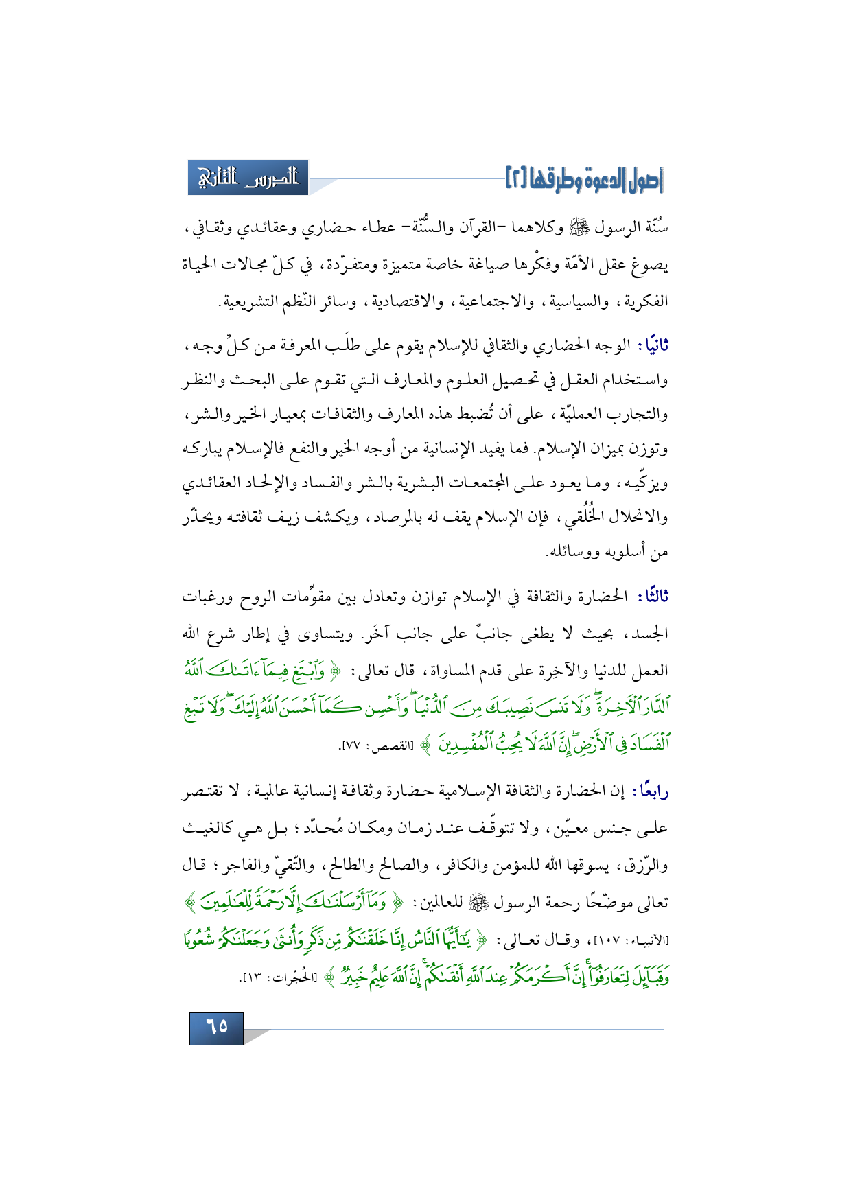 ثالثاً: الحضارة والثقافة في الإسلام توازن وتعادل بين مقوِّمات الروح ورغبات الجسد، بحيث لا يطغى جانبٌ على جانب آخَر. ويتساوى في إطار شرع الله العمل للدنيا والآخِرة على قدم المساواة، قال تعالى: {وَابْتَغِ فِيمَا آتَاكَ اللَّهُ الدَّارَ الآخِرَةَ وَلاَ تَنْسَ نَصِيبَكَ مِنَ الدُّنْيَا وَأَحْسِنْ كَمَا أَحْسَنَ اللَّهُ إِلَيْكَ وَلاَ تَبْغِ الْفَسَادَ فِي الأَرْضِ إِنَّ اللَّهَ لاَ يُحِبُّ الْمُفْسِدِينَ}.