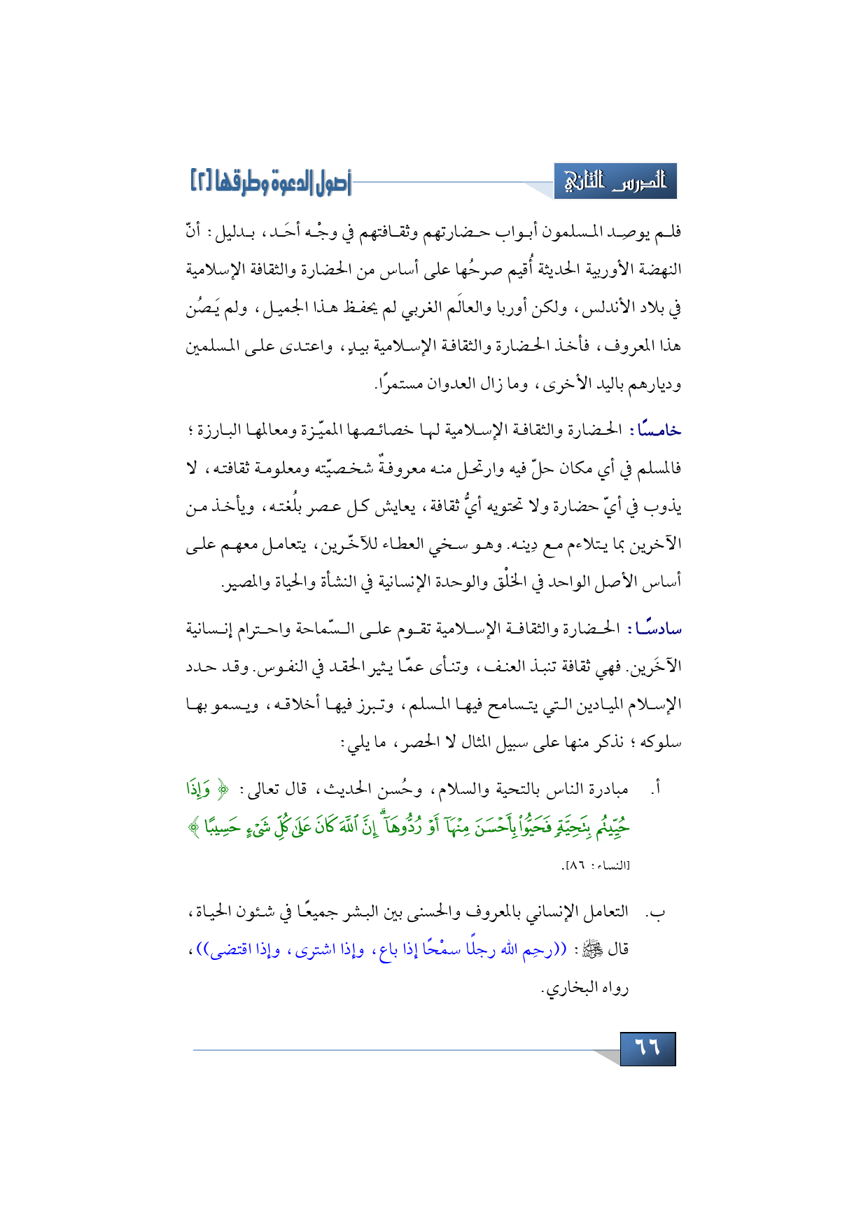 سادساً: الحضارة والثقافة الإسلامية تقوم على السّماحة واحترام إنسانية الآخَرين. فهي ثقافة تنبذ العنف، وتنأى عمّا يثير الحقد في النفوس. وقد حدد الإسلام الميادين التي يتسامح فيها المسلم، وتبرز فيها أخلاقه، ويسمو بها سلوكه؛ نذكر منها على سبيل المثال لا الحصر، ما يلي: