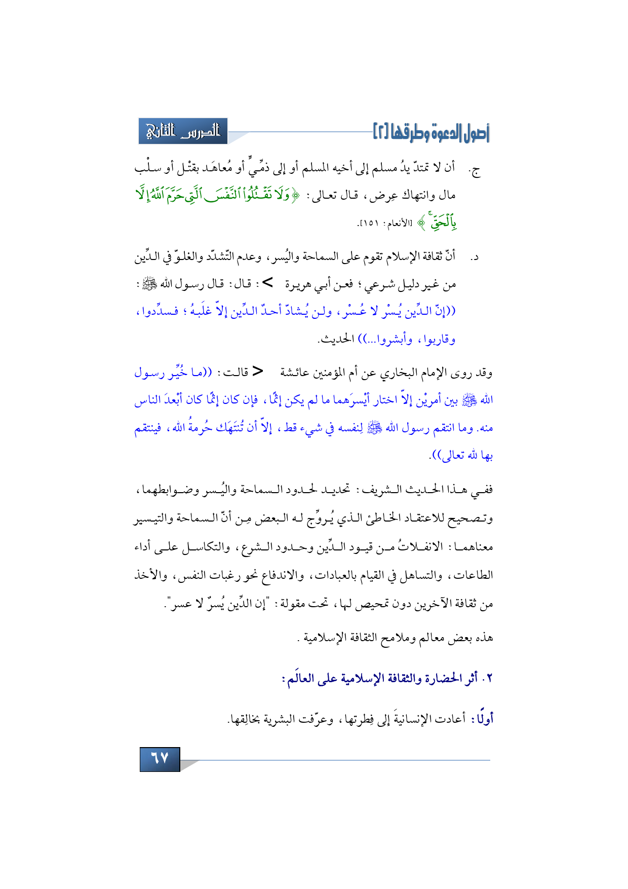 د- أنّ ثقافة الإسلام تقوم على السماحة واليُسر، وعدم التّشدّد والغلوّ في الدِّين من غير دليل شرعي؛ فعن أبي هريرة -رضي الله تعالى عنه-: قال: قال رسول الله -صلى الله عليه وسلم-: ((إنّ الدِّين يُسْر لا عُسْر، ولن يُشادّ أحدٌ الدِّين إلاّ غلَبهُ؛ فسدِّدوا، وقاربوا، وأبشروا ... )) الحديث.