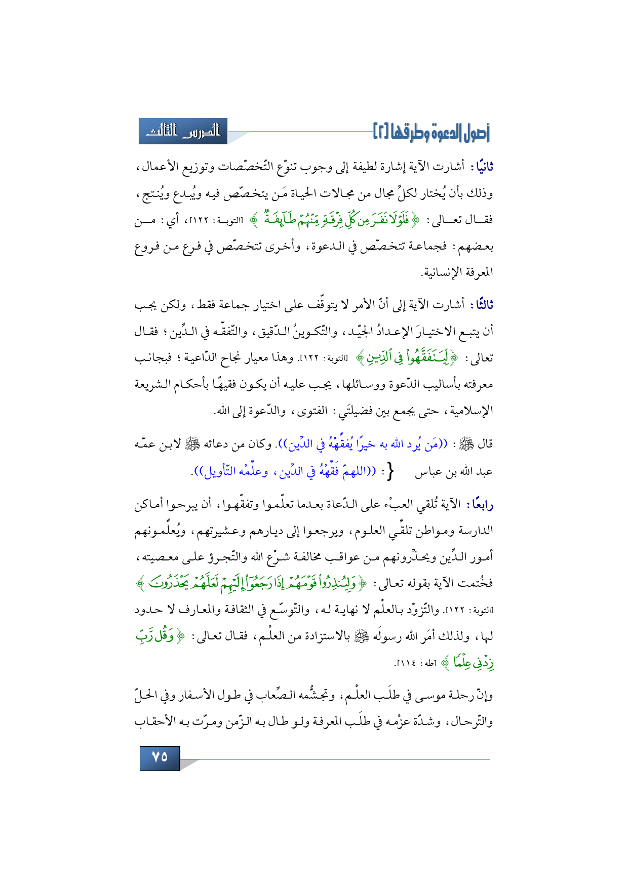 ثالثاً: أشارت الآية إلى أنّ الأمر لا يتوقّف على اختيار جماعة فقط، ولكن يجب أن يتبع الاختيارَ الإعدادُ الجيّد، والتّكوينُ الدّقيق، والتّفقّه في الدِّين؛ فقال تعالى: {لِيَتَفَقَّهُوا فِي الدِّينِ}. وهذا معيار نجاح الدّاعية؛ فبجانب معرفته بأساليب الدّعوة ووسائلها، يجب عليه أن يكون فقيهاً بأحكام الشريعة الإسلامية، حتى يجمع بين فضيلتَي: الفتوى والدّعوة إلى الله.