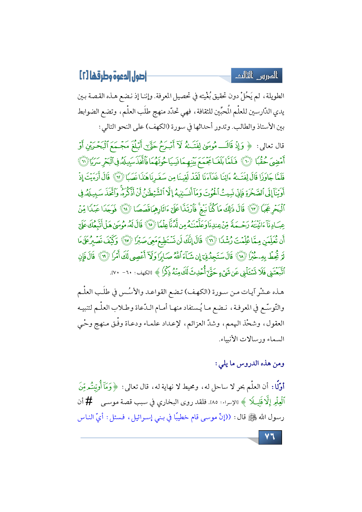 الطويلة، لم يَحُلْ دون تحقيق بُغْيته في تحصيل المعرفة. وإننا إذ نضع هذه القصة بين يدي الدّارسين للعلْم المُحبِّين للثقافة، فهي تحدّد منهج طلَب العلْم، وتضع الضوابط بين الأستاذ والطالب. وتدور أحداثها في سورة (الكهف) على النحو التالي: