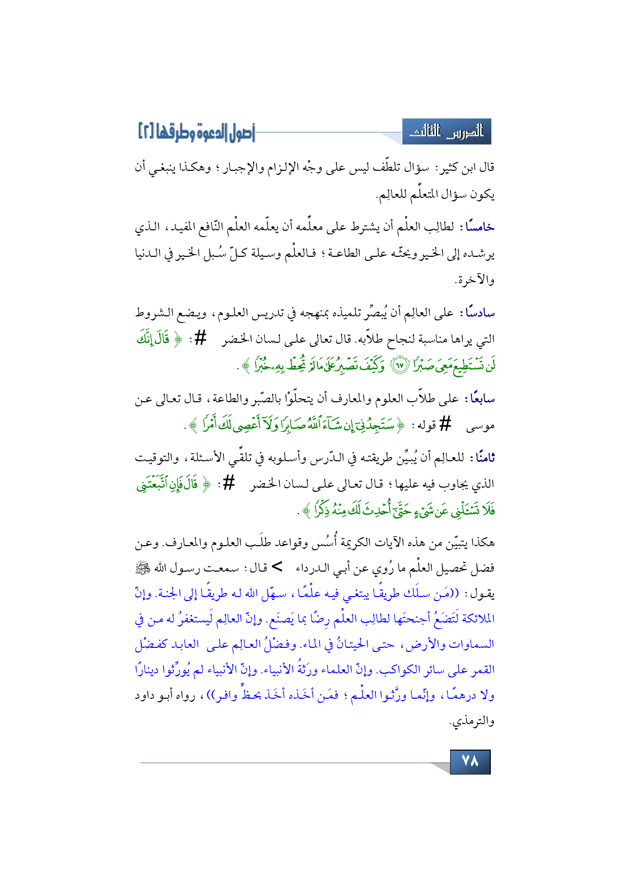 ثامناً: للعالِم أن يُبيِّن طريقته في الدّرس وأسلوبه في تلقِّي الأسئلة، والتوقيت الذي يجاوب فيه عليها؛ قال تعالى على لسان الخضر -عليه السلام-: {قَالَ فَإِنِ اتَّبَعْتَنِي فَلاَ تَسْأَلْنِي عَنْ شَيْءٍ حَتَّى أُحْدِثَ لَكَ مِنْهُ ذِكْراً}.