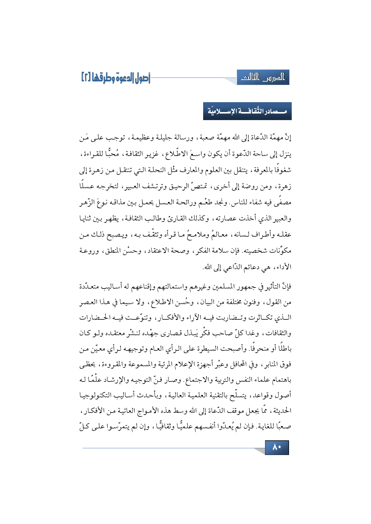 إنّ مهمّة الدّعاة إلى الله مهمّة صعبة، ورسالة جليلة وعظيمة، توجب على مَن ينزل إلى ساحة الدّعوة: أن يكون واسعَ الاطّلاع، غزير الثقافة، مُحباً للقراءة، شغوفا بالمعرفة، يتنقل بين العلوم والمعارف مثْل النحلة التي تنتقل من زهرة إلى زهرة، ومن روضة إلى أخرى، تمتصّ الرحيق وترتشف العبير، لتخرجه عسلاً مصفىً فيه شفاء للناس. ونجد طعْم ورائحة العسل يحمل بين مذاقه نوعَ الزّهر والعبير الذي أخذت عصارته، وكذلك القارئ وطالب الثقافة، يظهر بين ثنايا عقله وأطراف لسانه، معالمُ وملامحُ ما قرأه وتثقّف به، ويصبح ذلك من مكوِّنات شخصيته. فإن سلامة الفكر، وصحة الاعتقاد، وحسْن المنطق، وروعة الأداء، هي دعائم الدّاعي إلى الله. فإنّ التأثير في جمهور المسلمين وغيرهم، واستمالتهم وإقناعهم، له أساليب متعدّدة من القول، وفنون مختلفة من البيان، وحُسن الاطلاع، ولا سيما في هذا العصر الذي تكاثرت وتضاربت فيه الآراء والأفكار، وتنوّعت فيه الحضارات والثقافات، وغدا كلّ صاحب فكْر يَبذل قصارى جهْده لنشْر معتقده ولو كان باطلاً أو منحرفاً. وأصبحت السيطرة على الرأي العام وتوجيهه لرأي معيّن من فوق المنابر، وفي المحافل وعبْر أجهزة الإعلام المرئية والمسموعة والمقروءة، يحظى باهتمام علماء النفس والتربية والاجتماع. وصار فنّ التوجيه والإرشاد علْماً له أصول وقواعد، يتسلّح بالتقنية العلمية العالية، وبأحدث أساليب التكنولوجيا الحديثة، ممّا يجعل موقف الدّعاة إلى الله وسط هذه الأمواج العاتية من الأفكار، صعباً للغاية. فإن لم يُعدّوا أنفسهم علمياً وثقافياً، وإن لم يتمرّسوا على كلّ