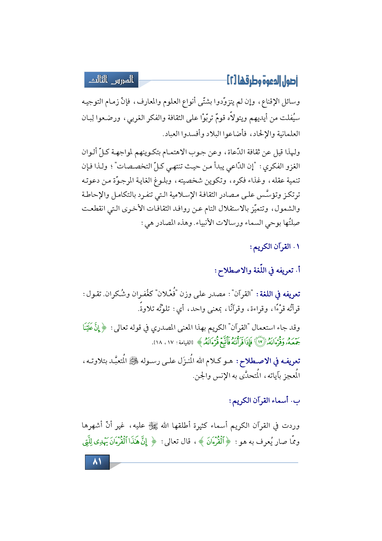 وسائل الإقناع، وإن لم يتزوّدوا بشتّى أنواع العلوم والمعارف، فإنّ زمام التوجيه سيُفلت من أيديهم، ويتولاّه قومٌ تربّوْا على الثقافة والفكر الغربي، ورضعوا لِبان العلمانية والإلحاد، فأضاعوا البلاد وأفسدوا العباد. ولهذا قيل عن ثقافة الدّعاة، وعن جوب الاهتمام بتكوينهم لمواجهة كلّ ألوان الغزو الفكري: "إن الدّاعي يبدأ من حيث تنتهي كلّ التخصصات"؛ ولذا فإن تنمية عقله، وغذاء فكره، وتكوين شخصيته، وبلوغ الغاية المرجوّة من دعوته ترتكز وتؤسَّس على مصادر الثقافة الإسلامية التي تنفرد بالتكامل والإحاطة والشمول، وتتميّز بالاستقلال التام عن روافد الثقافات الأخرى التي انقطعت صِلتُها بوحي السماء ورسالات الأنبياء.