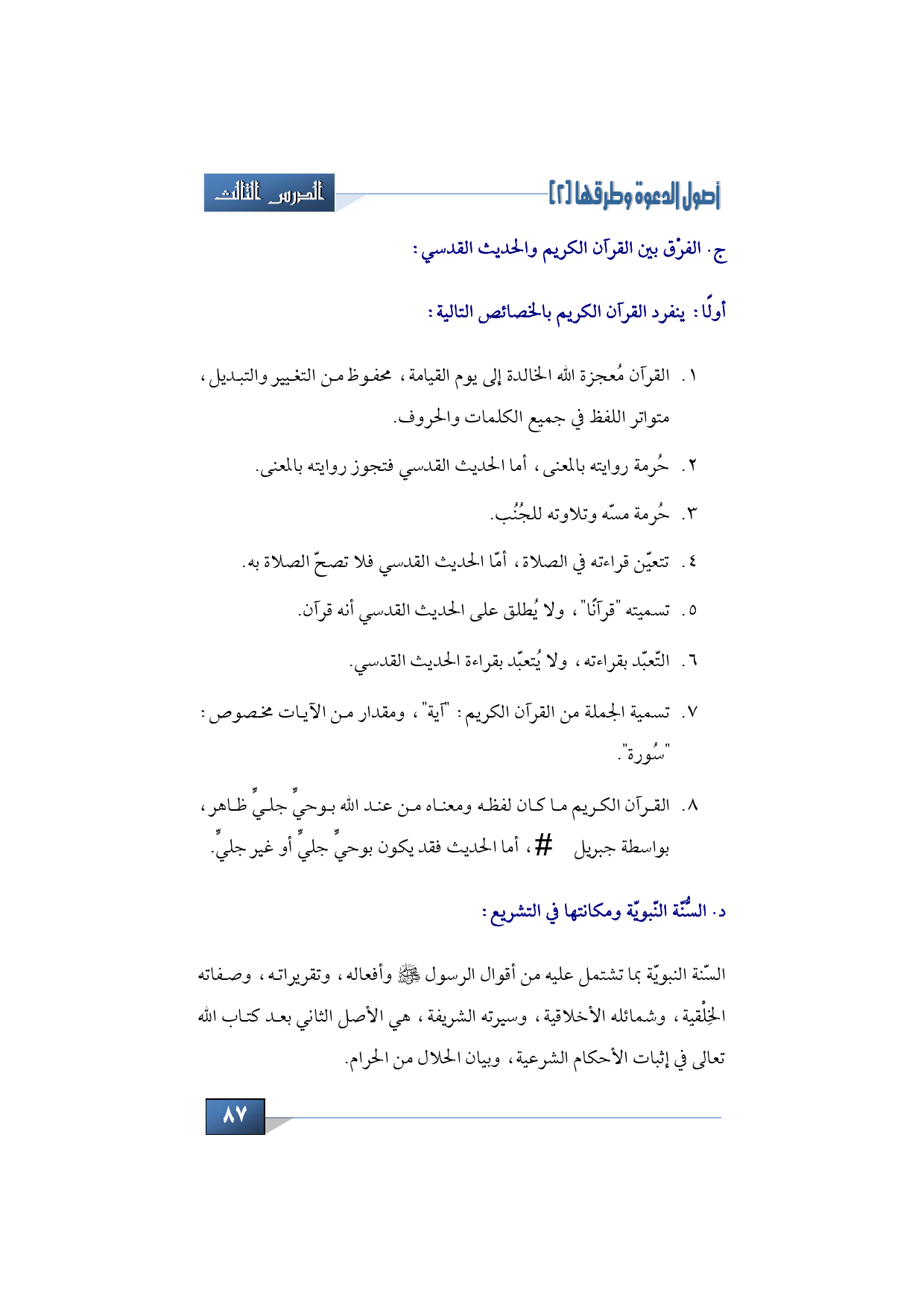 8 - القرآن الكريم ما كان لفظه ومعناه من عند الله بوحي جليّ ظاهر، بواسطة جبريل عليه السلام، أما الحديث فقد يكون بوحي جليّ أو غير جليّ.