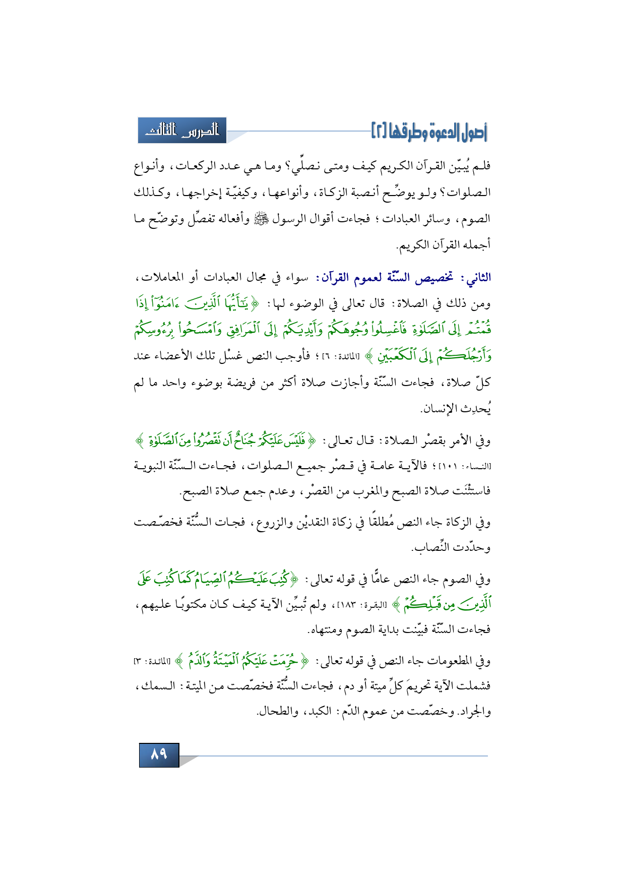 2 - تخصيص السّنّة لعموم القرآن، سواء في مجال العبادات أو المعاملات، ومن ذلك في الصلاة: قال تعالى في الوضوء لها: {يَا أَيُّهَا الَّذِينَ آمَنُوا إِذَا قُمْتُمْ إِلَى الصَّلاةِ فَاغْسِلُوا وُجُوهَكُمْ وَأَيْدِيَكُمْ إِلَى الْمَرَافِقِ وَامْسَحُوا بِرُؤُوسِكُمْ وَأَرْجُلَكُمْ إِلَى الْكَعْبَيْنِ}؛ فأوجب النص غسْل تلك الأعضاء عند كلّ صلاة، فجاءت السّنّة وأجازت صلاة أكثر من فريضة بوضوء واحد ما لم يُحدِث الإنسان.
