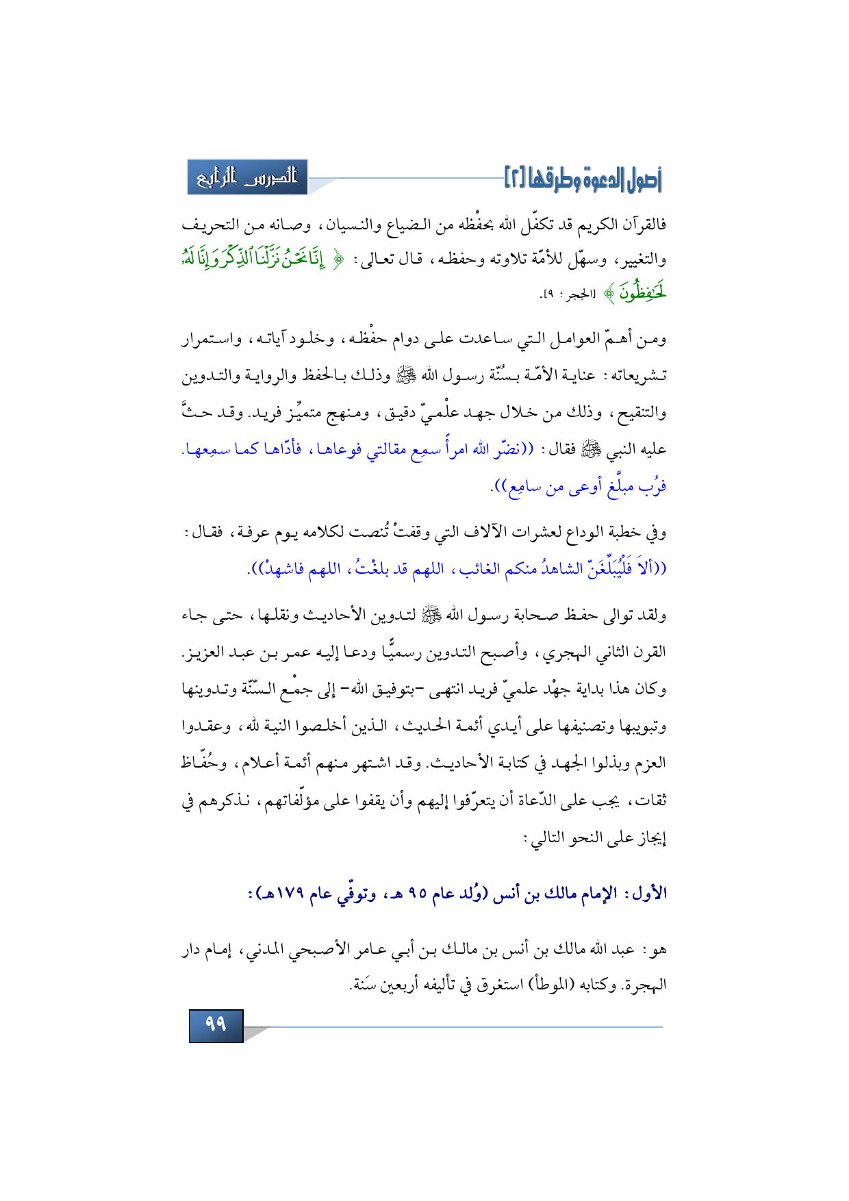 ومن أهمّ العوامل التي ساعدت على دوام حفْظه، وخلود آياته واستمرار تشريعاته: عناية الأمّة بسُنّة رسول الله -صلى الله عليه وسلم-، وذلك بالحفظ والرواية والتدوين والتنقيح، وذلك من خلال جهد علْميّ دقيق، ومنهج متميِّز فريد. وقد حثّ عليه النبي -صلى الله عليه وسلم- فقال: ((نضّر الله امرأً سمِع مقالتي فوعاها، فأدّاها كما سمِعها. فرُب مبلَّغ أوعى من سامِع)).