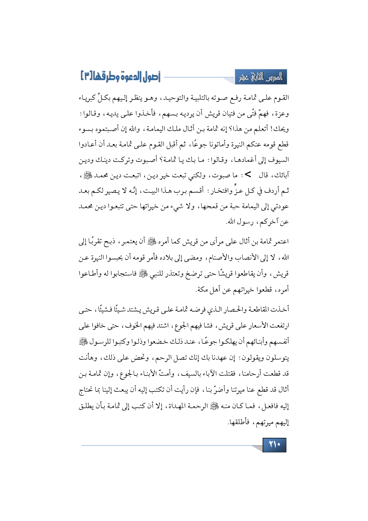 القوم على ثمامة رفع صوته بالتلبية والتوحيد، وهو ينظر إليهم بكلِّ كبرياء وعزة، فهمّ فتًى من فتيان قريش أن يرديه بسهم، فأخذوا على يديه، وقالوا: ويحك! أتعلم من هذا؟ إنه ثمامة بن أثال ملك اليمامة، والله إن أصبتموه بسوء قطع قومه عنكم النيرة وأماتونا جوعًا، ثم أقبل القوم على ثمامة بعد أن أعادوا السيوف إلى أغمادها، وقالوا: ما بك يا ثمامة؟ أصبوت وتركت دينك ودين آبائك، قال -رضي الله عنه-: ما صبوت، ولكني تبعت خير دين، اتبعت دين محمد -صلى الله عليه وسلم-، ثم أردف في كل عزٍّ وافتخار: أقسم برب هذا البيت، إنّه لا يصير لكم بعد عودتي إلى اليمامة حبة من قمحها، ولا شيء من خيراتها حتى تتبعوا دين محمد عن آخركم، رسول الله.