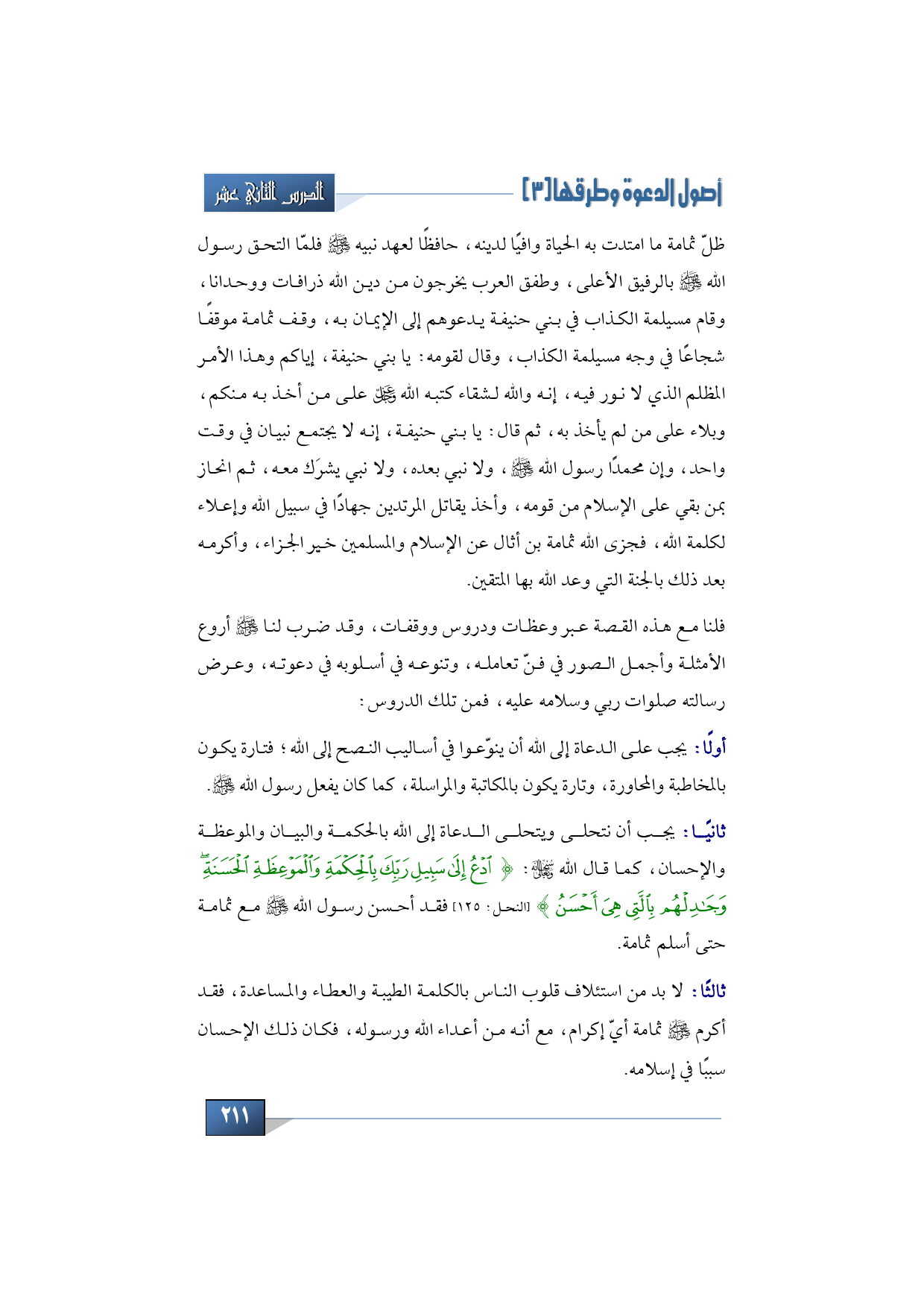 ثانيًا: يجب أن نتحلى ويتحلى الدعاة إلى الله بالحكمة والبيان والموعظة والإحسان، كما قال الله سبحانه وتعالى: {ادْعُ إِلَى سَبِيلِ رَبِّكَ بِالْحِكْمَةِ وَالْمَوْعِظَةِ الْحَسَنَةِ وَجَادِلْهُمْ بِالَّتِي هِيَ أَحْسَنُ} (النحل: 125) فقد أحسن رسول الله -صلى الله عليه وسلم- مع ثمامة حتى أسلم ثمامة.