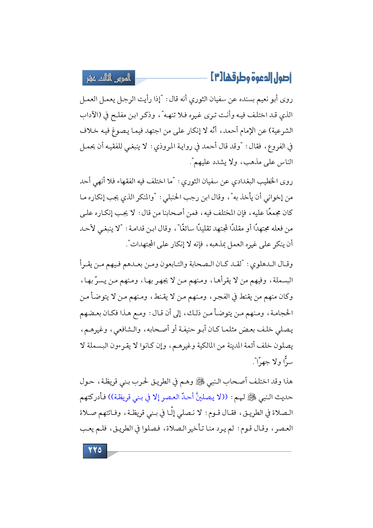 روى أبو نعيم بسنده عن سفيان الثوري أنه قال: "إذا رأيت الرجل يعمل العمل الذي قد اختلف فيه وأنت ترى غيره فلا تنهه"، وذكر ابن مفلح في (الآداب الشرعية) عن الإمام أحمد، أنّه لا إنكار على من اجتهد فيما يصوغ فيه خلاف في الفروع، فقال: "وقد قال أحمد في رواية المروذي: لا ينبغي للفقيه أن يحمل الناس على مذهب، ولا يشدد عليهم".