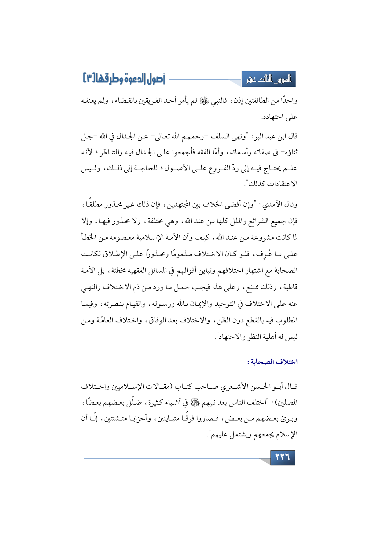 وقال الآمدي: "وإن أفضى الخلاف بين المجتهدين، فإن ذلك غير محذور مطلقًا، فإن جميع الشرائع والملل كلها من عند الله، وهي مختلفة، ولا محذور فيها، وإلا لما كانت مشروعة من عند الله، كيف وأن الأمة الإسلامية معصومة من الخطأ على ما عُرِف، فلو كان الاختلاف مذمومًا ومحذورًا على الإطلاق لكانت الصحابة مع اشتهار اختلافهم وتباين أقوالهم في المسائل الفقهية مخطئة، بل الأمة قاطبة، وذلك ممتنع، وعلى هذا فيجب حمل ما ورد من ذم الاختلاف والنهي عنه على الاختلاف في التوحيد والإيمان بالله ورسوله، والقيام بنصرته، وفيما المطلوب فيه بالقطع دون الظن، والاختلاف بعد الوفاق، واختلاف العامّة ومن ليس له أهلية النظر والاجتهاد".