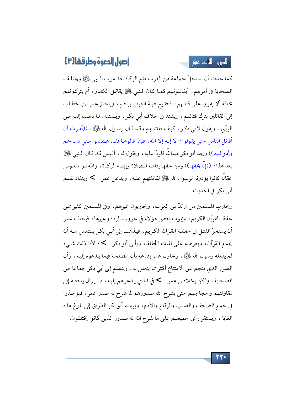 كما حدث أن استحلّ جماعة من العرب منع الزكاة بعد موت النبي -صلى الله عليه وسلم- ويختلف الصحابة في أمرهم: أيقاتلونهم كما كان النبي -صلى الله عليه وسلم- يقاتل الكفار، أم يتركونهم مخافة ألا يقووا على قتالهم، فتضيع هيبة العرب إياهم، وينحاز عمر بن الخطاب إلى القائلين بترك قتالهم، ويشتد في خلاف أبي بكر، ويستدل لما ذهب إليه من الرأي، ويقول لأبي بكر: كيف نقاتلهم وقد قال رسول الله -صلى الله عليه وسلم: ((أمرت أن أقاتل الناس حتى يقولوا: لا إله إلا الله، فإذا قالوها فقد عصموا مني دماءهم وأموالهم)) ويجد أبو بكر مساغًا للردّ عليه، ويقول له: أليس قد قال النبي -صلى الله عليه وسلم- بعد هذا: ((إلّا بحقها)) ومن حقها إقامة الصلاة وإيتاء الزكاة، والله لو منعوني عقالًا كانوا يؤدونه لرسول الله -صلى الله عليه وسلم- لقاتلتهم عليه، ويذعن عمر -رضي الله عنه- وينقاد لفهم أبي بكر في الحديث.
