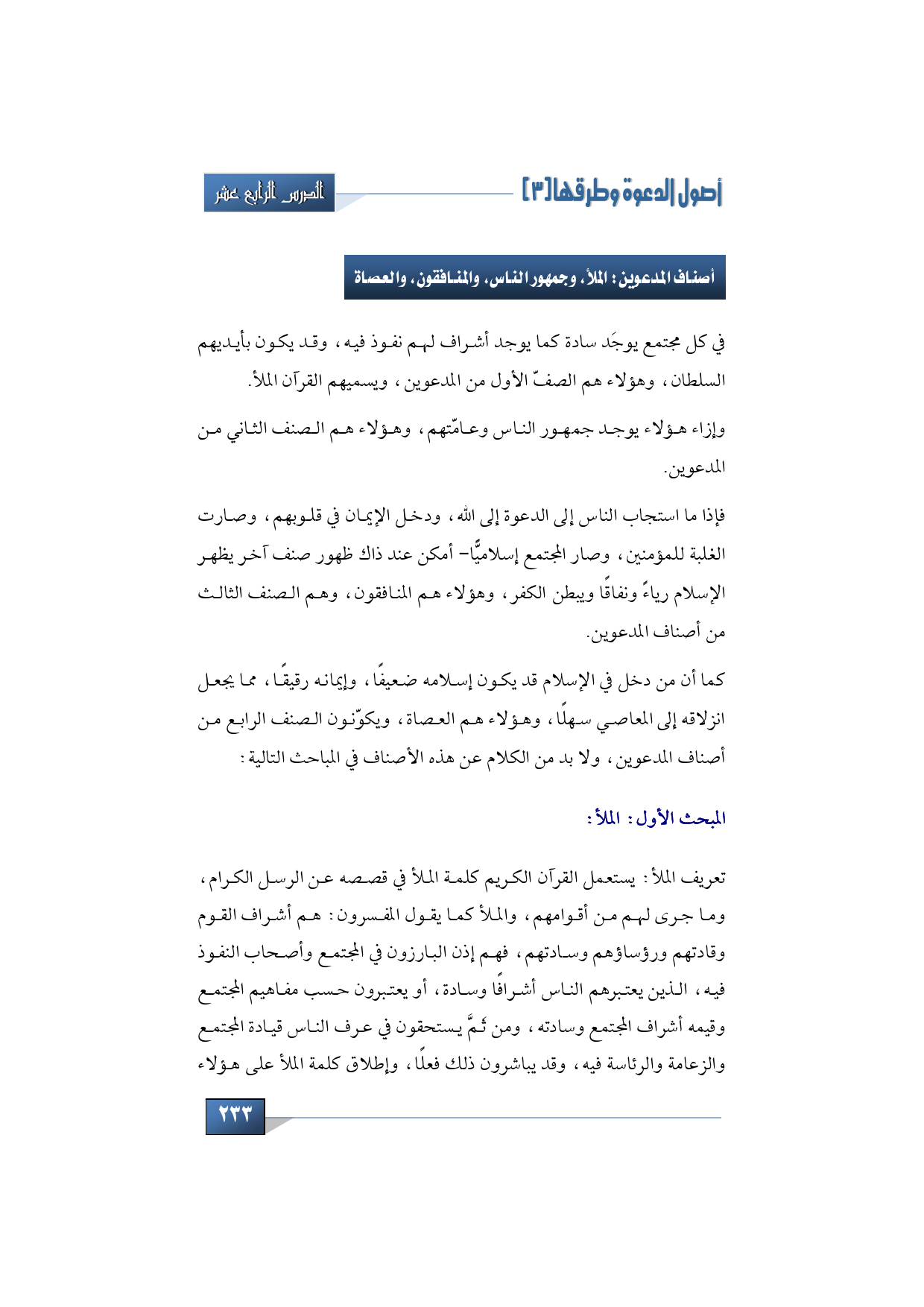 في كل مجتمع يوجَد سادة كما يوجد أشراف لهم نفوذ فيه، وقد يكون بأيديهم السلطان، وهؤلاء هم الصفّ الأول من المدعوين، ويسميهم القرآن الملأ.