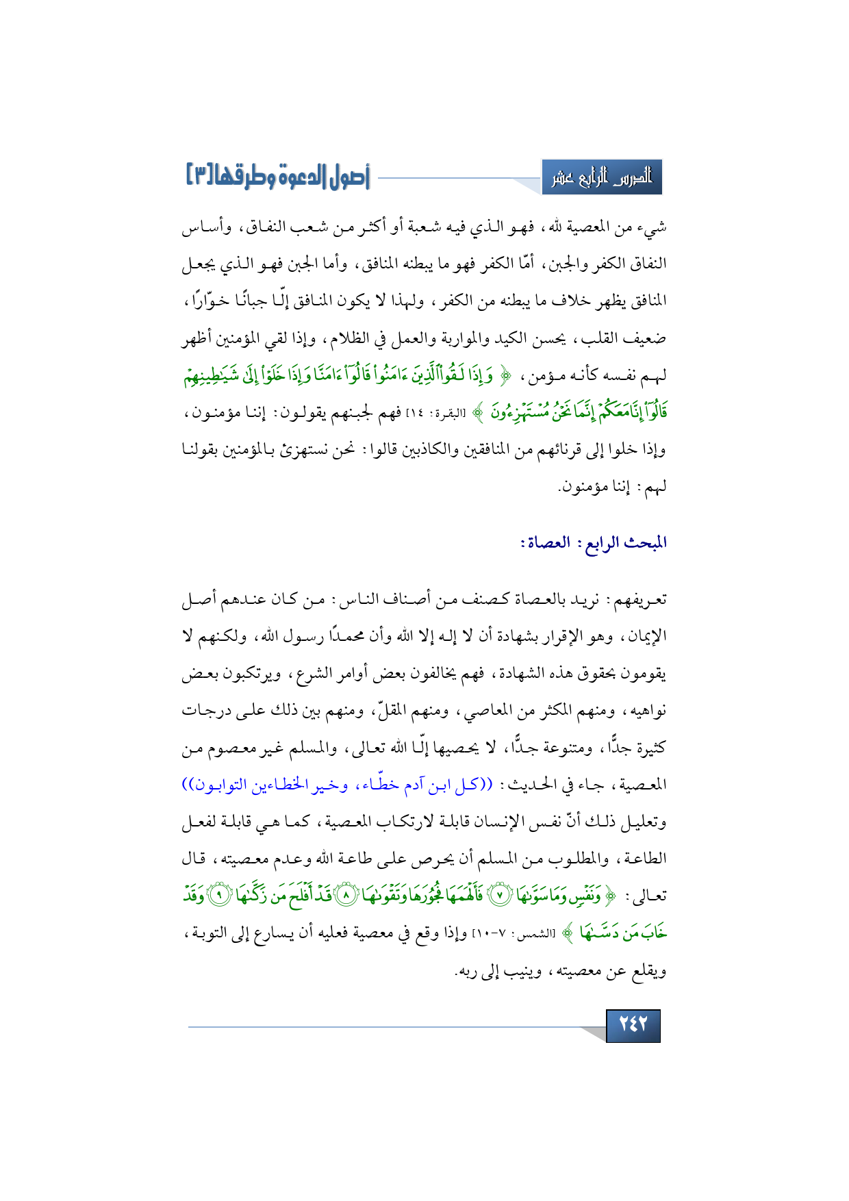 تعريفهم: نريد بالعصاة كصنف من أصناف الناس: من كان عندهم أصل الإيمان، وهو الإقرار بشهادة أن لا إله إلا الله وأن محمدًا رسول الله، ولكنهم لا يقومون بحقوق هذه الشهادة، فهم يخالفون بعض أوامر الشرع، ويرتكبون بعض نواهيه، ومنهم المكثر من المعاصي، ومنهم المقلّ، ومنهم بين ذلك على درجات كثيرة جدًّا، ومتنوعة جدًّا، لا يحصيها إلّا الله تعالى، والمسلم غير معصوم من المعصية، جاء في الحديث: ((كل ابن آدم خطّاء، وخير الخطاءين التوابون)) وتعليل ذلك أنّ نفس الإنسان قابلة لارتكاب المعصية، كما هي قابلة لفعل الطاعة، والمطلوب من المسلم أن يحرص على طاعة الله وعدم معصيته، قال تعالى: {وَنَفْسٍ وَمَا سَوَّاهَا * فَأَلْهَمَهَا فُجُورَهَا وَتَقْوَاهَا * قَدْ أَفْلَحَ مَنْ زَكَّاهَا * وَقَدْ خَابَ مَنْ دَسَّاهَا} (الشمس: 7 - 10) وإذا وقع في معصية فعليه أن يسارع إلى التوبة، ويقلع عن معصيته، وينيب إلى ربه.