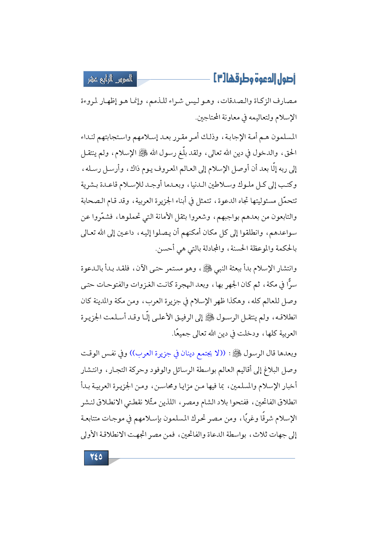 وبعدها قال الرسول -صلى الله عليه وسلم: ((لا يجتمع دينان في جزيرة العرب)) وفي نفس الوقت وصل البلاغ إلى أقاليم العالم بواسطة الرسائل والوفود وحركة التجار، وانتشار أخبار الإسلام والمسلمين، بما فيها من مزايا ومحاسن، ومن الجزيرة العربية بدأ انطلاق الفاتحين، ففتحوا بلاد الشام ومصر، اللذين مثّلا نقطتي الانطلاق لنشر الإسلام شرقًا وغربًا، ومن مصر تحرك المسلمون بإسلامهم في موجات متتابعة إلى جهات ثلاث، بواسطة الدعاة والفاتحين، فمن مصر اتجهت الانطلاقة الأولى