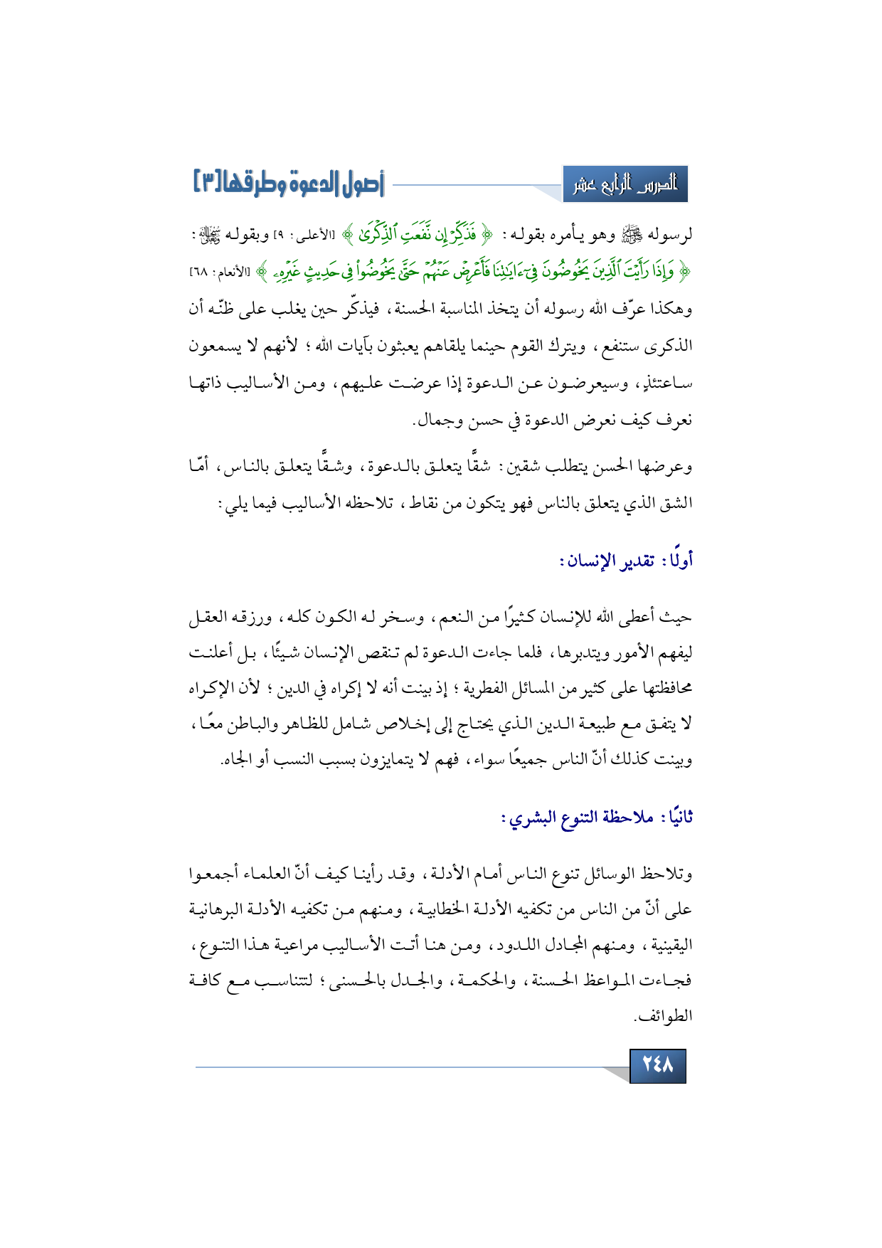 - لرسوله -صلى الله عليه وسلم- وهو يأمره بقوله: {فَذَكِّرْ إِنْ نَفَعَتِ الذِّكْرَى} (الأعلى: 9) وبقوله -سبحانه وتعالى: {وَإِذَا رَأَيْتَ الَّذِينَ يَخُوضُونَ فِي آيَاتِنَا فَأَعْرِضْ عَنْهُمْ حَتَّى يَخُوضُوا فِي حَدِيثٍ غَيْرِهِ} (الأنعام: 68) وهكذا عرّف الله رسوله أن يتخذ المناسبة الحسنة، فيذكّر حين يغلب على ظنّه أن الذكرى ستنفع، ويترك القوم حينما يلقاهم يعبثون بآيات الله؛ لأنهم لا يسمعون ساعتئذٍ، وسيعرضون عن الدعوة إذا عرضت عليهم، ومن الأساليب ذاتها نعرف كيف نعرض الدعوة في حسن وجمال.