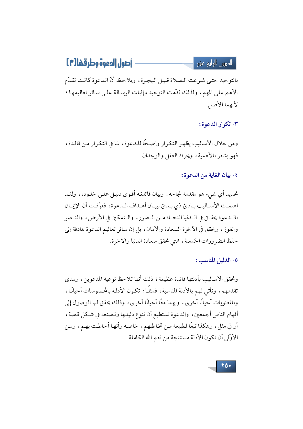 ومن خلال الأساليب يظهر التكرار واضحًا للدعوة، لما في التكرار من فائدة، فهو يشعر بالأهمية، ويحرك العقل والوجدان.