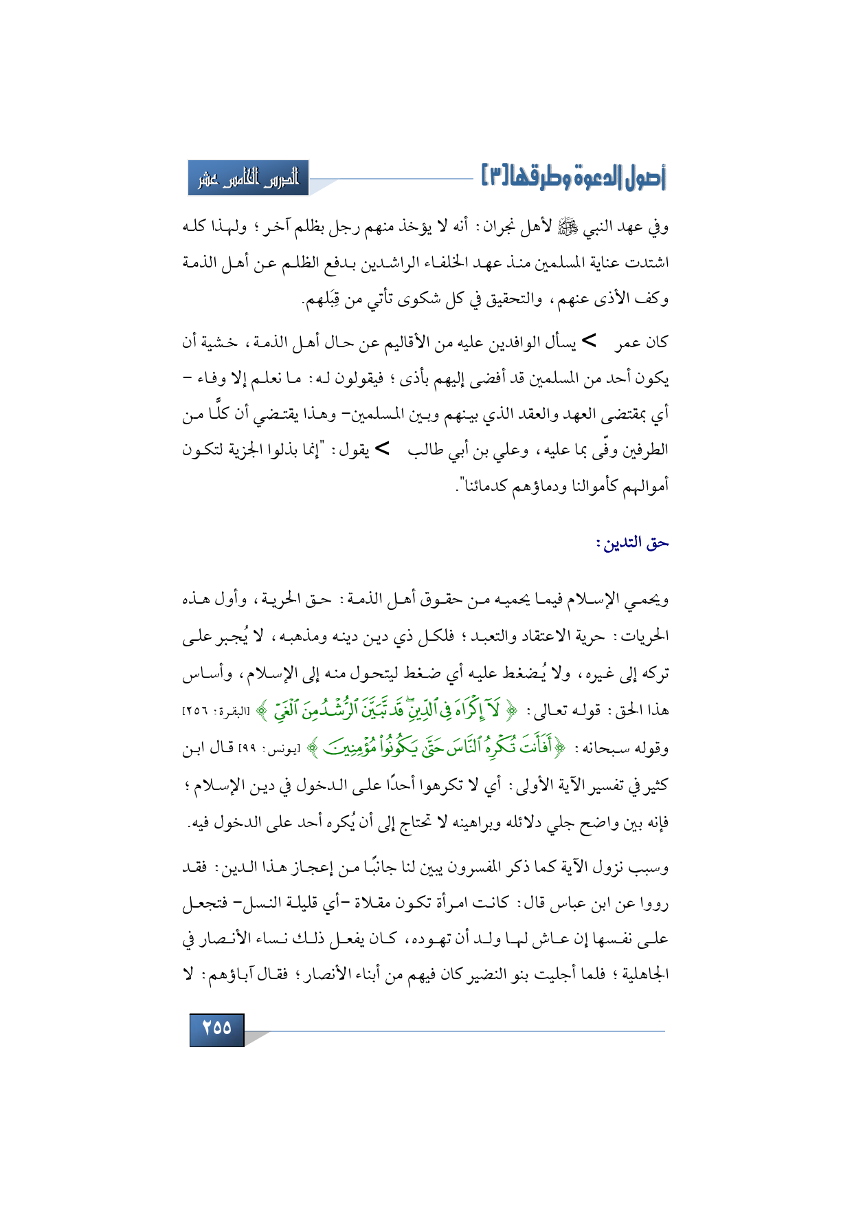ويحمي الإسلام فيما يحميه من حقوق أهل الذمة: حق الحرية، وأول هذه الحريات: حرية الاعتقاد والتعبد؛ فلكل ذي دين دينه ومذهبه، لا يُجبر على تركه إلى غيره، ولا يُضغط عليه أي ضغط ليتحول منه إلى الإسلام، وأساس هذا الحق: قوله تعالى: {لَا إِكْرَاهَ فِي الدِّينِ قَدْ تَبَيَّنَ الرُّشْدُ مِنَ الْغَيِّ} (البقرة: 256) وقوله سبحانه: {أَفَأَنْتَ تُكْرِهُ النَّاسَ حَتَّى يَكُونُوا مُؤْمِنِينَ} (يونس: 99) قال ابن كثير في تفسير الآية الأولى: أي لا تكرهوا أحدًا على الدخول في دين الإسلام؛ فإنه بين واضح جلي دلائله وبراهينه لا تحتاج إلى أن يُكره أحد على الدخول فيه.