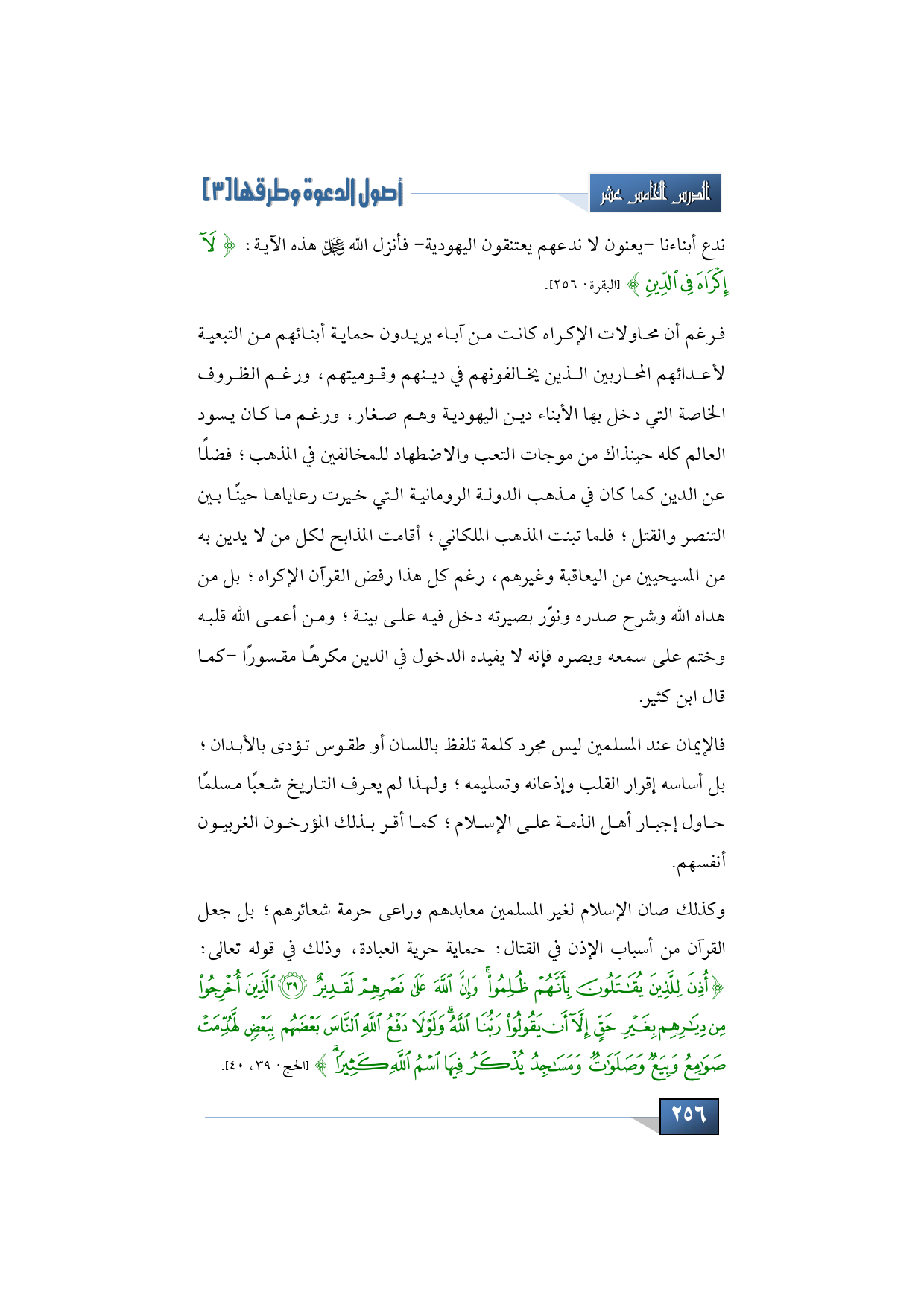 وكذلك صان الإسلام لغير المسلمين معابدهم وراعى حرمة شعائرهم؛ بل جعل القرآن من أسباب الإذن في القتال: حماية حرية العبادة، وذلك في قوله تعالى: {أُذِنَ لِلَّذِينَ يُقَاتَلُونَ بِأَنَّهُمْ ظُلِمُوا وَإِنَّ اللَّهَ عَلَى نَصْرِهِمْ لَقَدِيرٌ * الَّذِينَ أُخْرِجُوا مِنْ دِيَارِهِمْ بِغَيْرِ حَقٍّ إِلَّا أَنْ يَقُولُوا رَبُّنَا اللَّهُ وَلَوْلَا دَفْعُ اللَّهِ النَّاسَ بَعْضَهُمْ بِبَعْضٍ لَهُدِّمَتْ صَوَامِعُ وَبِيَعٌ وَصَلَوَاتٌ وَمَسَاجِدُ يُذْكَرُ فِيهَا اسْمُ اللَّهِ كَثِيرًا} (الحج: 39، 40).