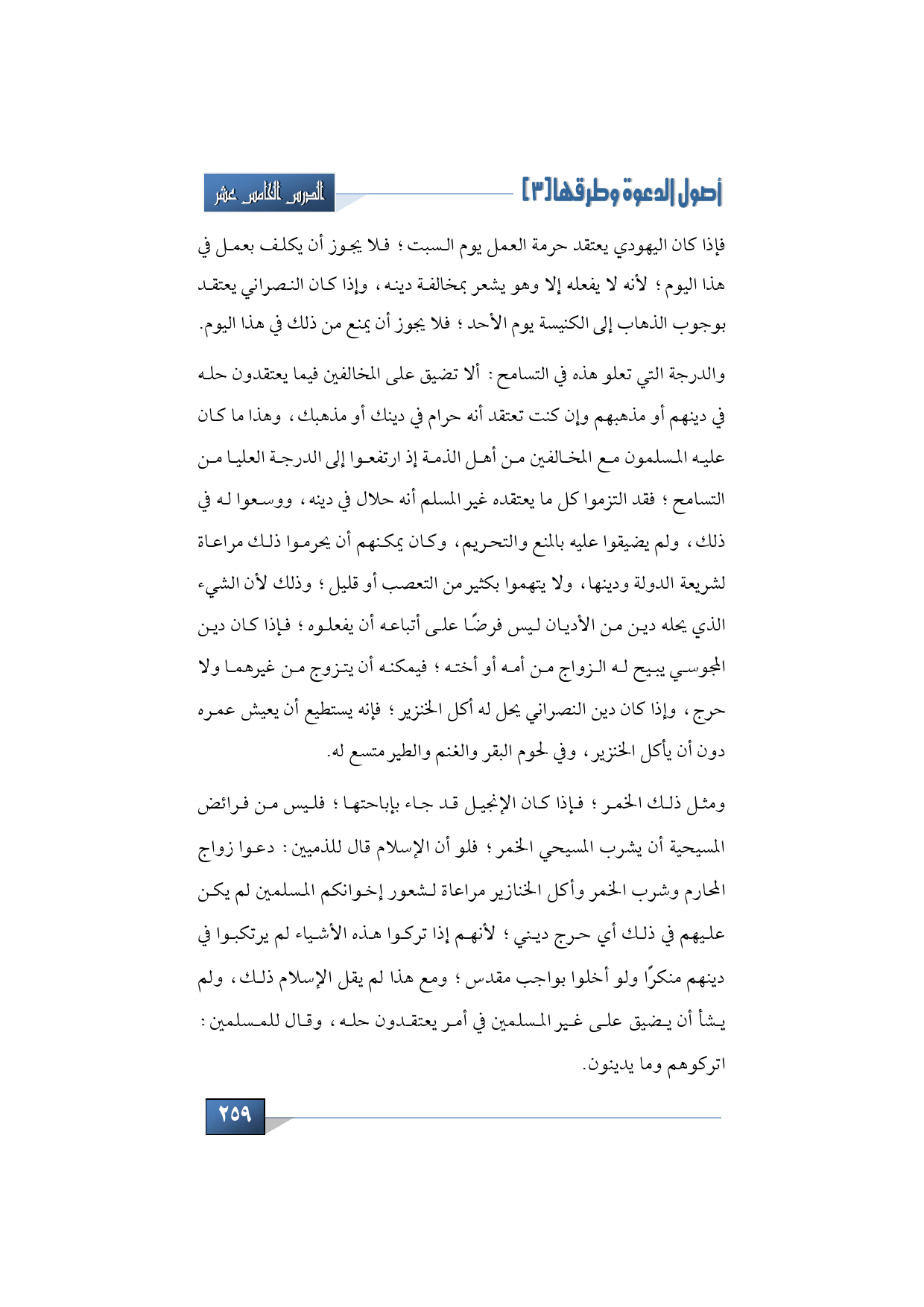 والدرجة التي تعلو هذه في التسامح: ألا تضيق على المخالفين فيما يعتقدون حله في دينهم أو مذهبهم وإن كنت تعتقد أنه حرام في دينك أو مذهبك، وهذا ما كان عليه المسلمون مع المخالفين من أهل الذمة إذ ارتفعوا إلى الدرجة العليا من التسامح؛ فقد التزموا كل ما يعتقده غير المسلم أنه حلال في دينه، ووسعوا له في ذلك، ولم يضيقوا عليه بالمنع والتحريم، وكان يمكنهم أن يحرموا ذلك مراعاة لشريعة الدولة ودينها، ولا يتهموا بكثير من التعصب أو قليل؛ وذلك لأن الشيء الذي يحله دين من الأديان ليس فرضًا على أتباعه أن يفعلوه؛ فإذا كان دين المجوسي يبيح له الزواج من أمه أو أخته؛ فيمكنه أن يتزوج من غيرهما ولا حرج، وإذا كان دين النصراني يحل له أكل الخنزير؛ فإنه يستطيع أن يعيش عمره دون أن يأكل الخنزير، وفي لحوم البقر والغنم والطير متسع له.