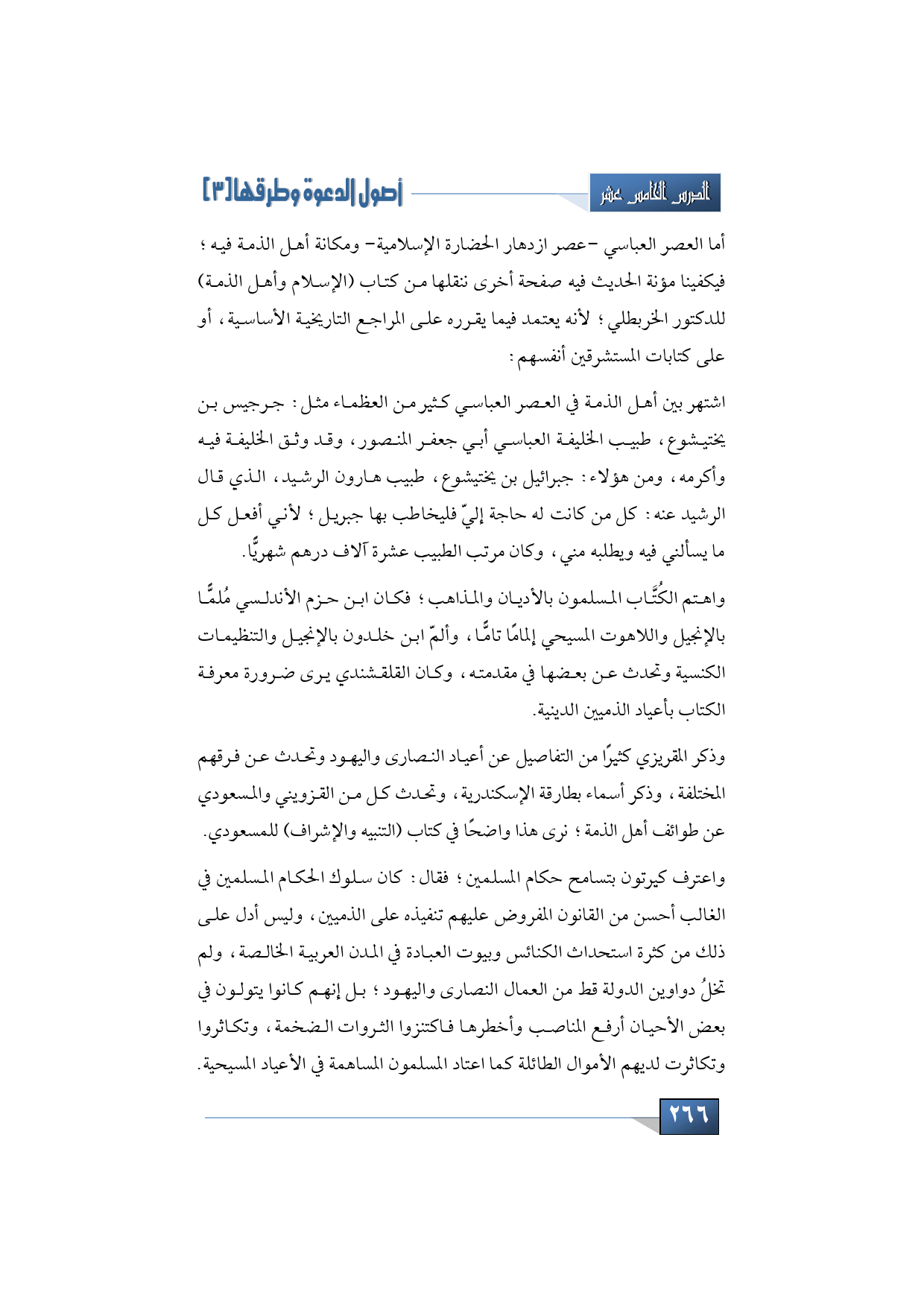 أما العصر العباسي -عصر ازدهار الحضارة الإسلامية- ومكانة أهل الذمة فيه؛ فيكفينا مؤنة الحديث فيه صفحة أخرى ننقلها من كتاب (الإسلام وأهل الذمة) للدكتور الخربطلي؛ لأنه يعتمد فيما يقرره على المراجع التاريخية الأساسية، أو على كتابات المستشرقين أنفسهم: