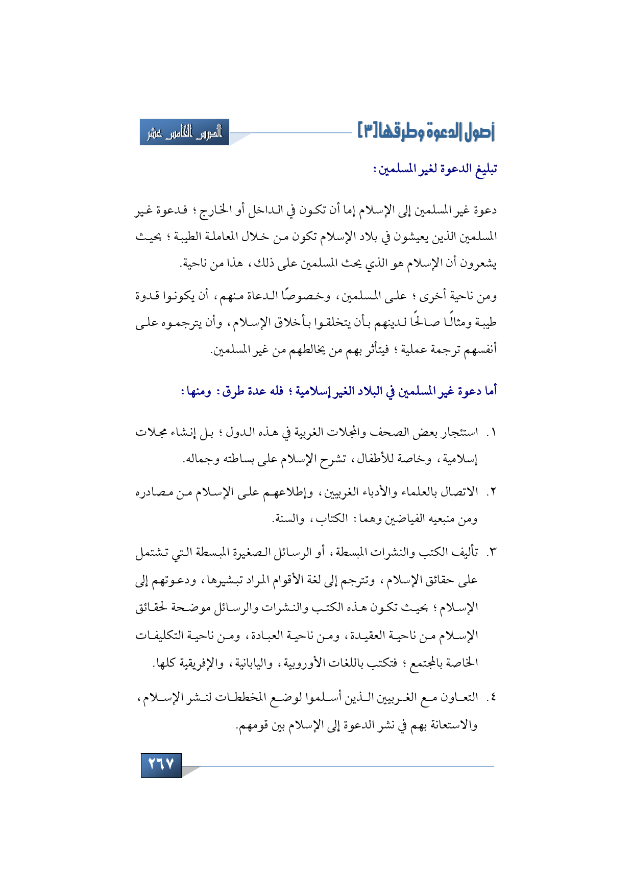 3 - تأليف الكتب والنشرات المبسطة، أو الرسائل الصغيرة المبسطة التي تشتمل على حقائق الإسلام، وتترجم إلى لغة الأقوام المراد تبشيرها، ودعوتهم إلى الإسلام؛ بحيث تكون هذه الكتب والنشرات والرسائل موضحة لحقائق الإسلام من ناحية العقيدة، ومن ناحية العبادة، ومن ناحية التكليفات الخاصة بالمجتمع؛ فتكتب باللغات الأوروبية، واليابانية، والإفريقية كلها.