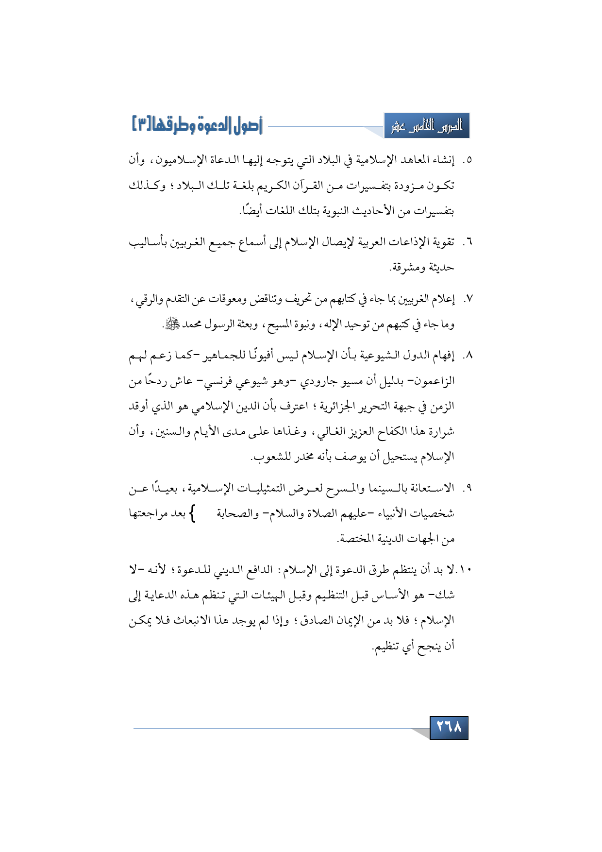 10 - لا بد أن ينتظم طرق الدعوة إلى الإسلام: الدافع الديني للدعوة؛ لأنه -لا شك- هو الأساس قبل التنظيم وقبل الهيئات التي تنظم هذه الدعاية إلى الإسلام؛ فلا بد من الإيمان الصادق؛ وإذا لم يوجد هذا الانبعاث فلا يمكن أن ينجح أي تنظيم.