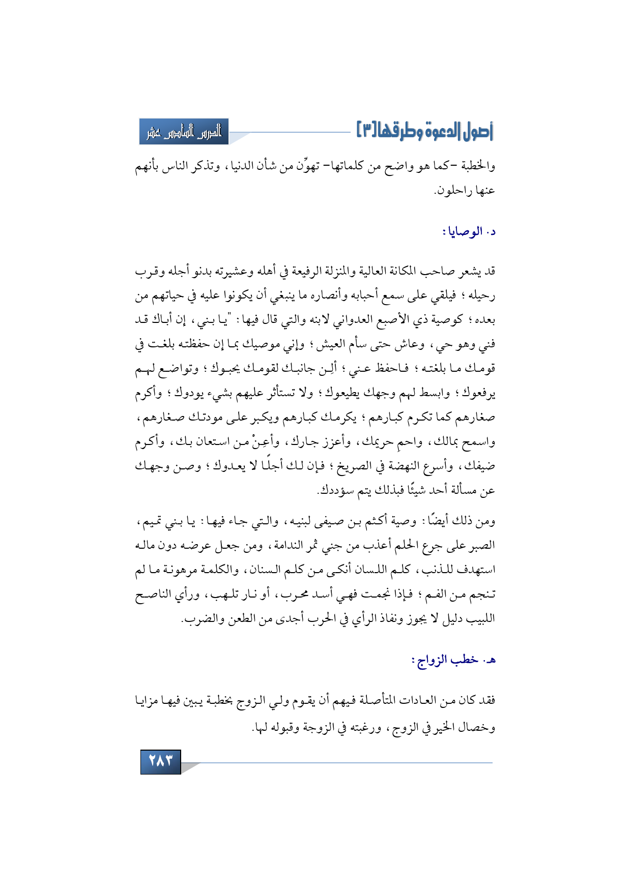 قد يشعر صاحب المكانة العالية والمنزلة الرفيعة في أهله وعشيرته بدنو أجله وقرب رحيله؛ فيلقي على سمع أحبابه وأنصاره ما ينبغي أن يكونوا عليه في حياتهم من بعده؛ كوصية ذي الأصبع العدواني لابنه والتي قال فيها: