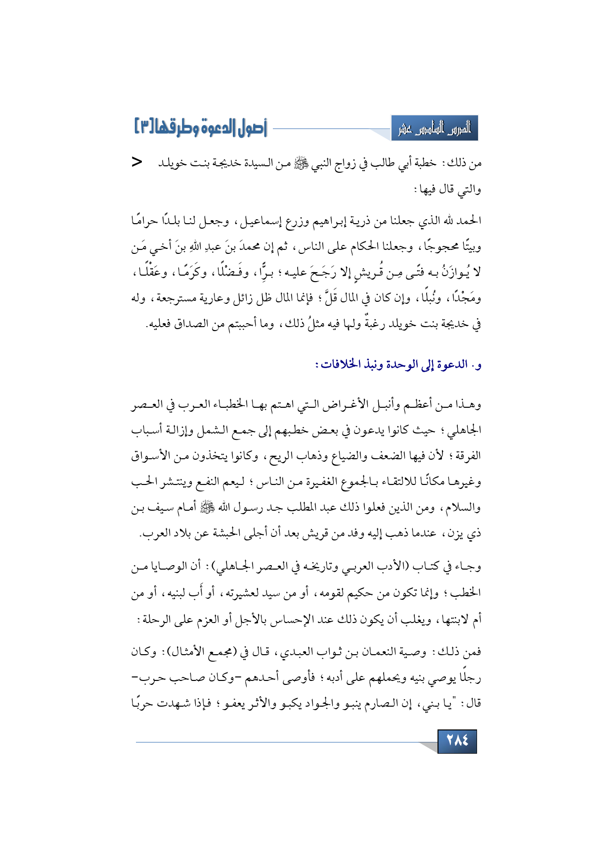 من ذلك: خطبة أبي طالب في زواج النبي -صلى الله عليه وسلم- من السيدة خديجة بنت خويلد -رضي الله عنها- والتي قال فيها: