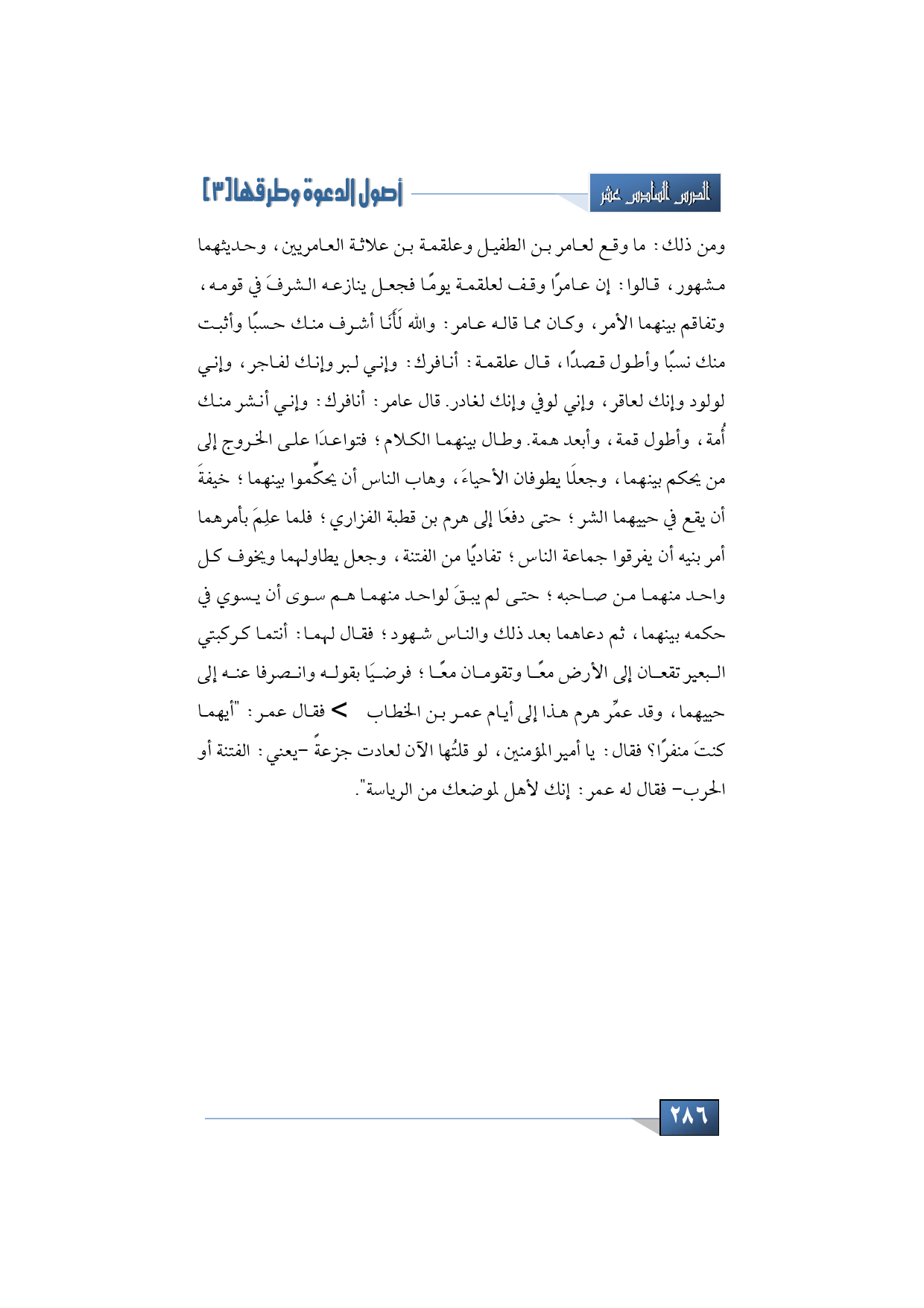 ومن ذلك: ما وقع لعامر بن الطفيل وعلقمة بن علاثة العامريين، وحديثهما مشهور، قالوا: إن عامرًا وقف لعلقمة يومًا فجعل ينازعه الشرفَ في قومه، وتفاقم بينهما الأمر، وكان مما قاله عامر: والله لَأَنَا أشرف منك حسبًا وأثبت منك نسبًا وأطول قصدًا، قال علقمة: أنافرك: وإني لبر وإنك لفاجر، وإني لولود وإنك لعاقر، وإني لوفي وإنك لغادر. قال عامر: أنافرك: وإني أنشر منك أُمة، وأطول قمة، وأبعد همة. وطال بينهما الكلام؛ فتواعدَا على الخروج إلى من يحكم بينهما، وجعلَا يطوفان الأحياءَ، وهاب الناس أن يحكِّموا بينهما؛ خيفةَ أن يقع في حييهما الشر؛ حتى دفعَا إلى هرم بن قطبة الفزاري؛ فلما علِمَ بأمرهما أمر بنيه أن يفرقوا جماعة الناس؛ تفاديًا من الفتنة، وجعل يطاولهما ويخوف كل واحد منهما من صاحبه؛ حتى لم يبقَ لواحد منهما هم سوى أن يسوي في حكمه بينهما، ثم دعاهما بعد ذلك والناس شهود؛ فقال لهما: أنتما كركبتي البعير تقعان إلى الأرض معًا وتقومان معًا؛ فرضيَا بقوله وانصرفا عنه إلى حييهما، وقد عمِّر هرم هذا إلى أيام عمر بن الخطاب -رضي الله عنه- فقال عمر: "أيهما كنتَ منفرًا؟ فقال: يا أمير المؤمنين، لو قلتُها الآن لعادت جزعةً -يعني: الفتنة أو الحرب- فقال له عمر: إنك لأهل لموضعك من الرياسة".