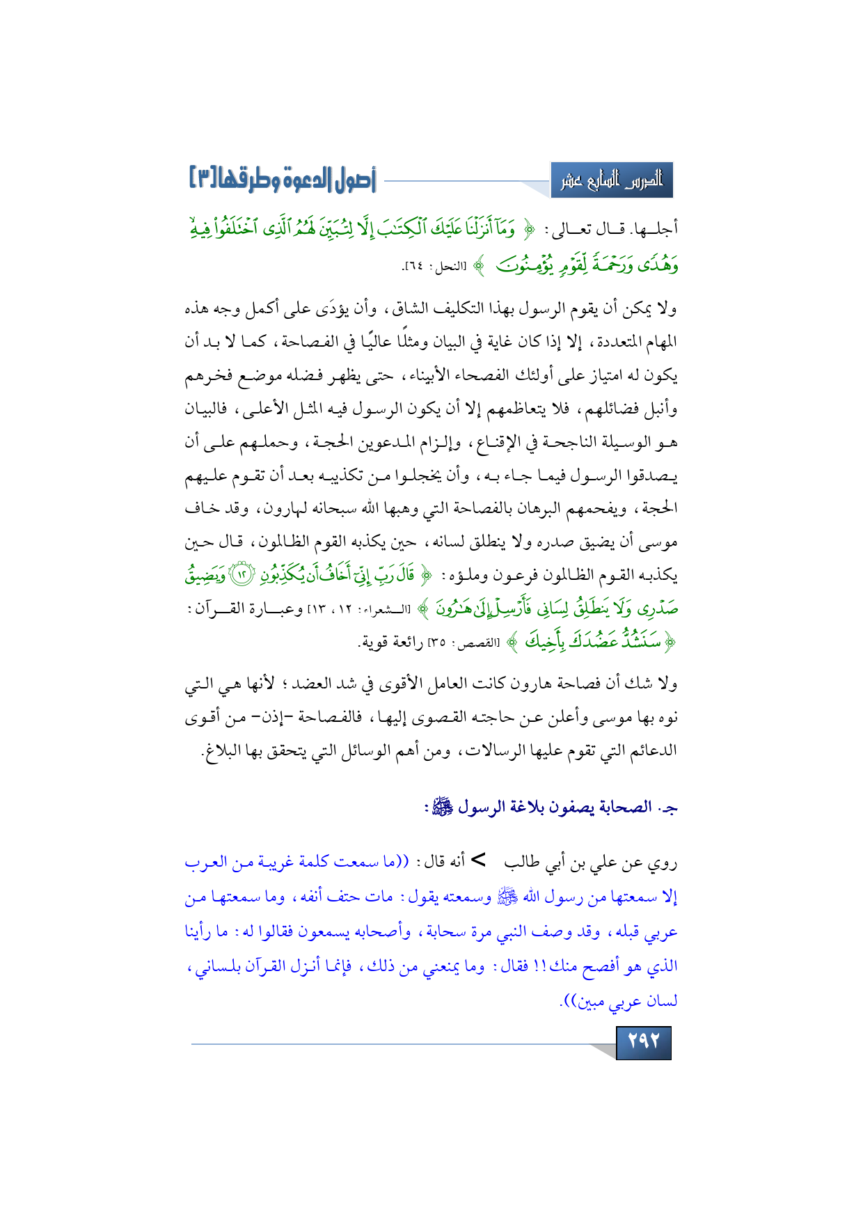 ولا يمكن أن يقوم الرسول بهذا التكليف الشاق، وأن يؤدَى على أكمل وجه هذه المهام المتعددة، إلا إذا كان غاية في البيان ومثلًا عاليًا في الفصاحة، كما لا بد أن يكون له امتياز على أولئك الفصحاء الأبيِناء، حتى يظهر فضله موضع فخرهم وأنبل فضائلهم، فلا يتعاظمهم إلا أن يكون الرسول فيه المثل الأعلى، فالبيان هو الوسيلة الناجحة في الإقناع، وإلزام المدعوين الحجة، وحملهم على أن يصدقوا الرسول فيما جاء به، وأن يخجلوا من تكذيبه بعد أن تقوم عليهم الحجة، ويفحمهم البرهان بالفصاحة التي وهبها الله سبحانه لهارون، وقد خاف موسى أن يضيق صدره ولا ينطلق لسانه، حين يكذبه القوم الظالمون، قال حين يكذبه القوم الظالمون فرعون وملؤه: {قَالَ رَبِّ إِنِّي أَخَافُ أَنْ يُكَذِّبُونِ * وَيَضِيقُ صَدْرِي وَلَا يَنْطَلِقُ لِسَانِي فَأَرْسِلْ إِلَى هَارُونَ} (الشعراء: 12، 13) وعبارة القرآن: {سَنَشُدُّ عَضُدَكَ بِأَخِيكَ} (القصص: 35) رائعة قوية.